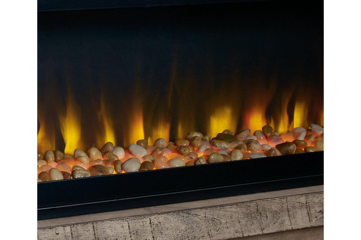 This extra-large TV stand with fireplace insert is sure to win your heart with its daring take on modern rustic expression. Its crisp, clean minimalist-chic profile is enriched with striking pine wood grain and a weathered gray finish with distressed saw mark texture. For your added viewing pleasure, the wide fireplace insert puts on a show via remote control. With the touch of a button, adjust the temperature, the color of the flame effect, or set the 12-hour timer for long-lasting enjoyment. The realistic flame effect includes color change option and faux glass crystals and natural rock inserts. Faux crystals enhance the flickering flame—or mix in stones for a natural touch (all included). Luna Furniture introduces Krystanza TV Stand with Electric Fireplace to enhance the beauty of your living spaces.