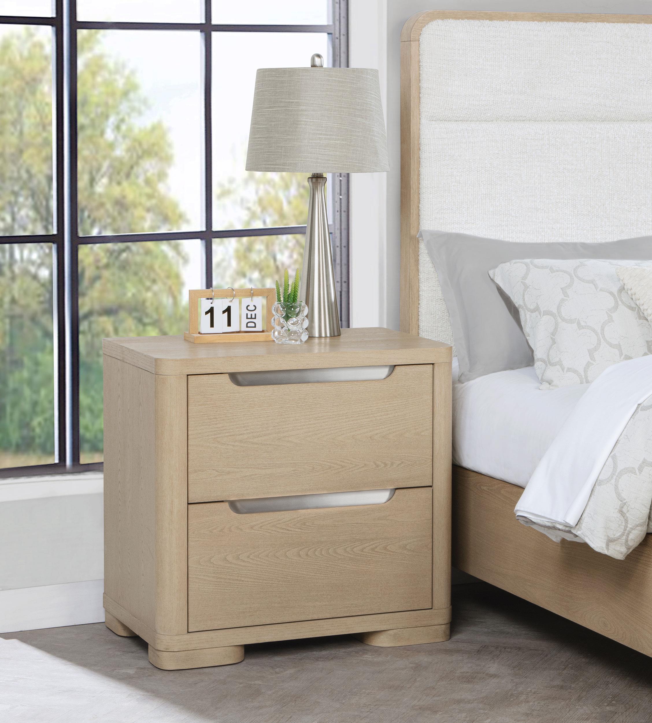 Blending sleek design with practical functionality, this nightstand features a light elm finish and brushed nickel fingertip pulls for a subtle sparkle. Rounded corners enhance its modern appeal, while two extra-large drawers offer ample space for bedside essentials. The top drawer, lined with gray felt, adds a touch of elegance. Cord management access provides convenience, making this piece perfect for modern living.