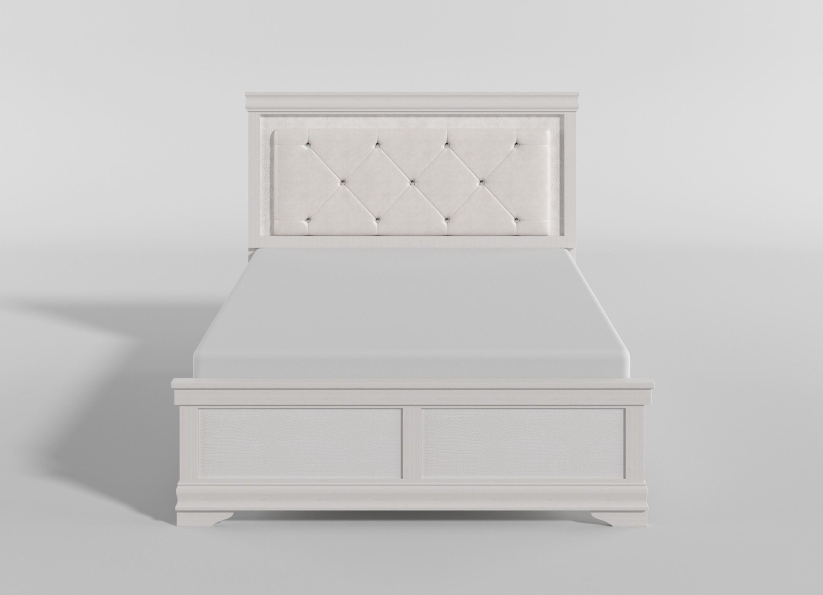 The unexpected intersection of traditional design and glamorous styling creates the dynamic look of the Lana Collection. A white finish is utilized to enhance the faux alligator embossed fronts of the Queen bed. The headboard features a faux leather crystal-tufted headboard as well as dramatic LED backlighting.