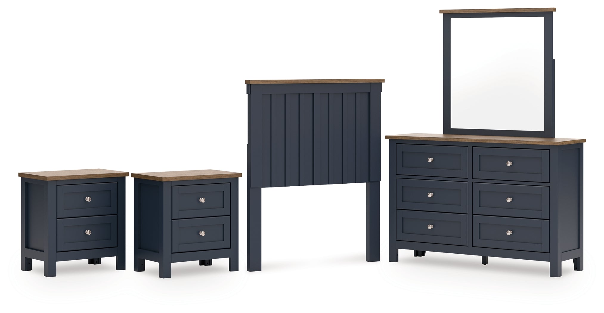 Landocken Twin Panel Headboard with Mirrored Dresser and 2 Nightstands in Brown/Blue