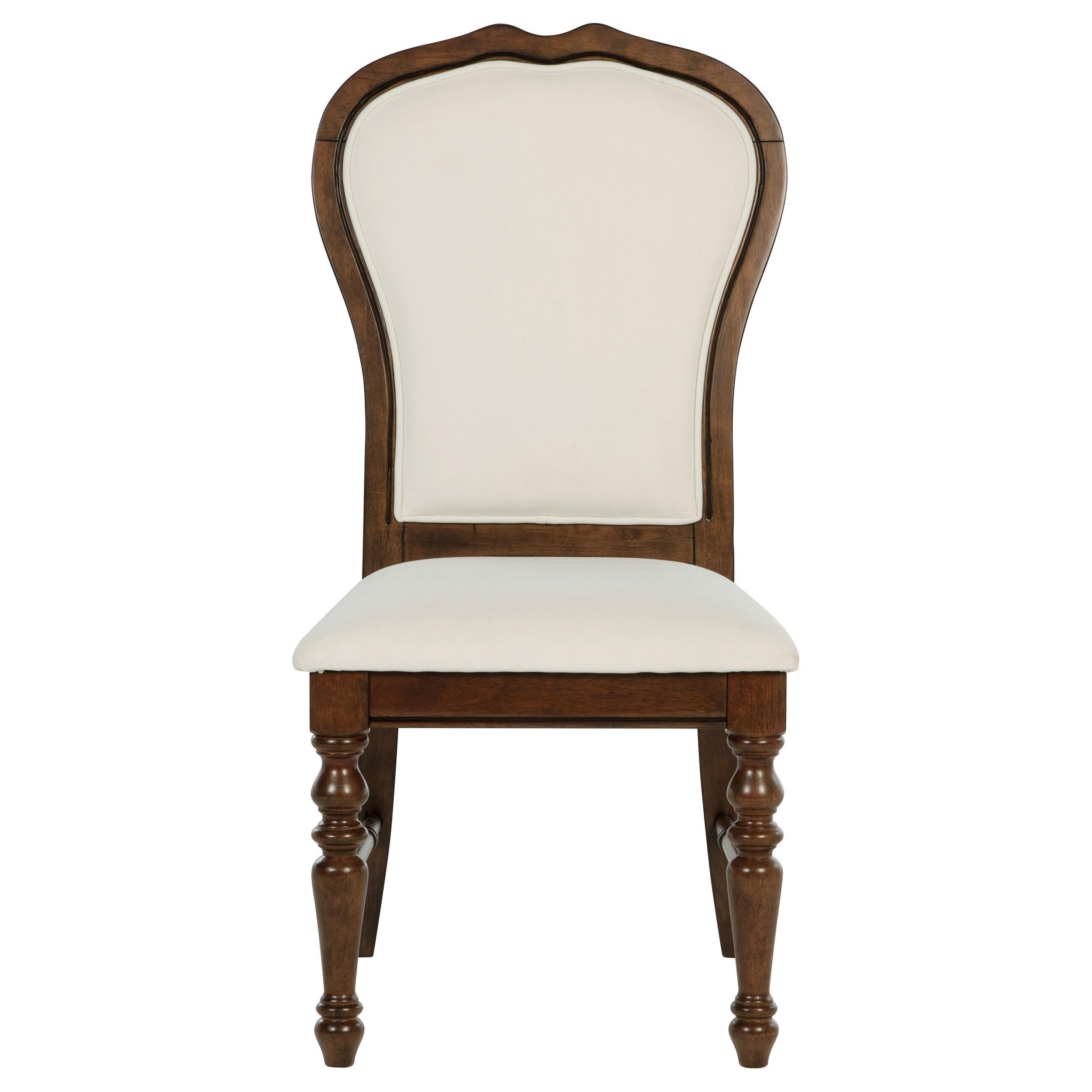 Complement your chic dining ensemble with a set of two traditional dining side chairs. Each boasts durable construction in Asian hardwood, complete with a rich brown finish. Chairs are designed with decorative rounded backs, framed in wood to create definition and character. Upholstery is paired with foam and features a crisp ivory color, creating contrast and depth against the rich wood grain. Legs are turned, with decorative stretchers that add detail and intricacy to your kitchen or dining room.