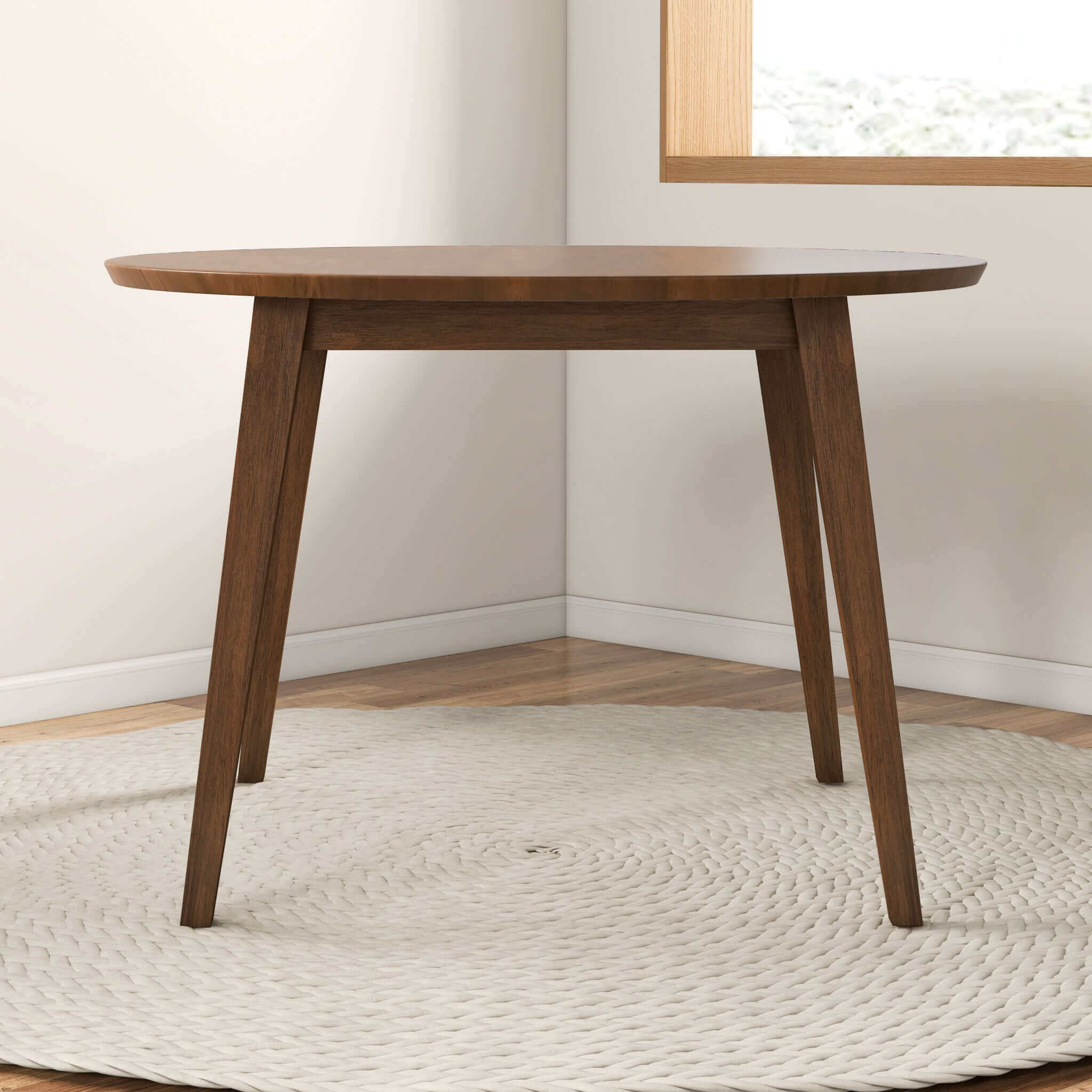 Enhance your dining room with this versatile mid-century modern round dining table. Crafted from durable, easy-to-clean wood, it comfortably accommodates 4 chairs. The beveled edges ensure safety, making it perfect for small kitchen sets. Its compact size suits various spaces like apartments, lofts, condos, and houses. Use it as a living room or breakfast table, or even as a study desk. With water-resistant solid wood construction and sturdy legs, this table offers durability and easy repair. Assembly is a breeze with the included tool and instructions. Experience style, quality, and affordability with this value-packed dining table.