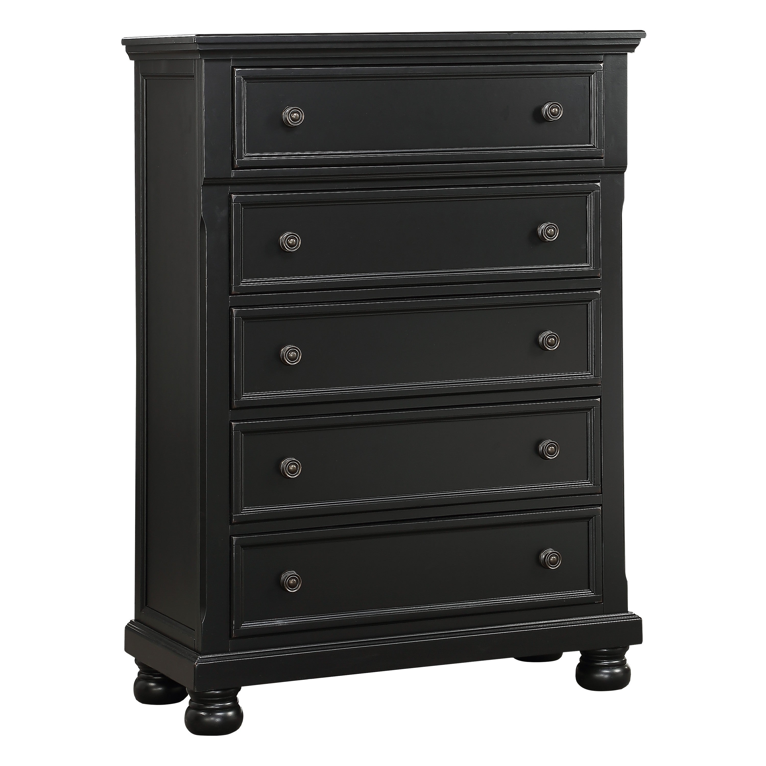 Casual transitional styling lends versatility to the placement of the Laurelin Collection in a number of bedroom settings. Black and White sand-through finishes are available creating distinctly different looks from traditional to country casual, with antiqued bronze knob hardware punctuating the look of each framed drawer front. Hidden drawers in the nightstand and dresser provide discrete storage for your valuables, while the storage drawers of the footboard provide a more visible means of additional storage capability. Bun feet support the case goods and a sleigh headboard finish off the transitional design of the collection.
