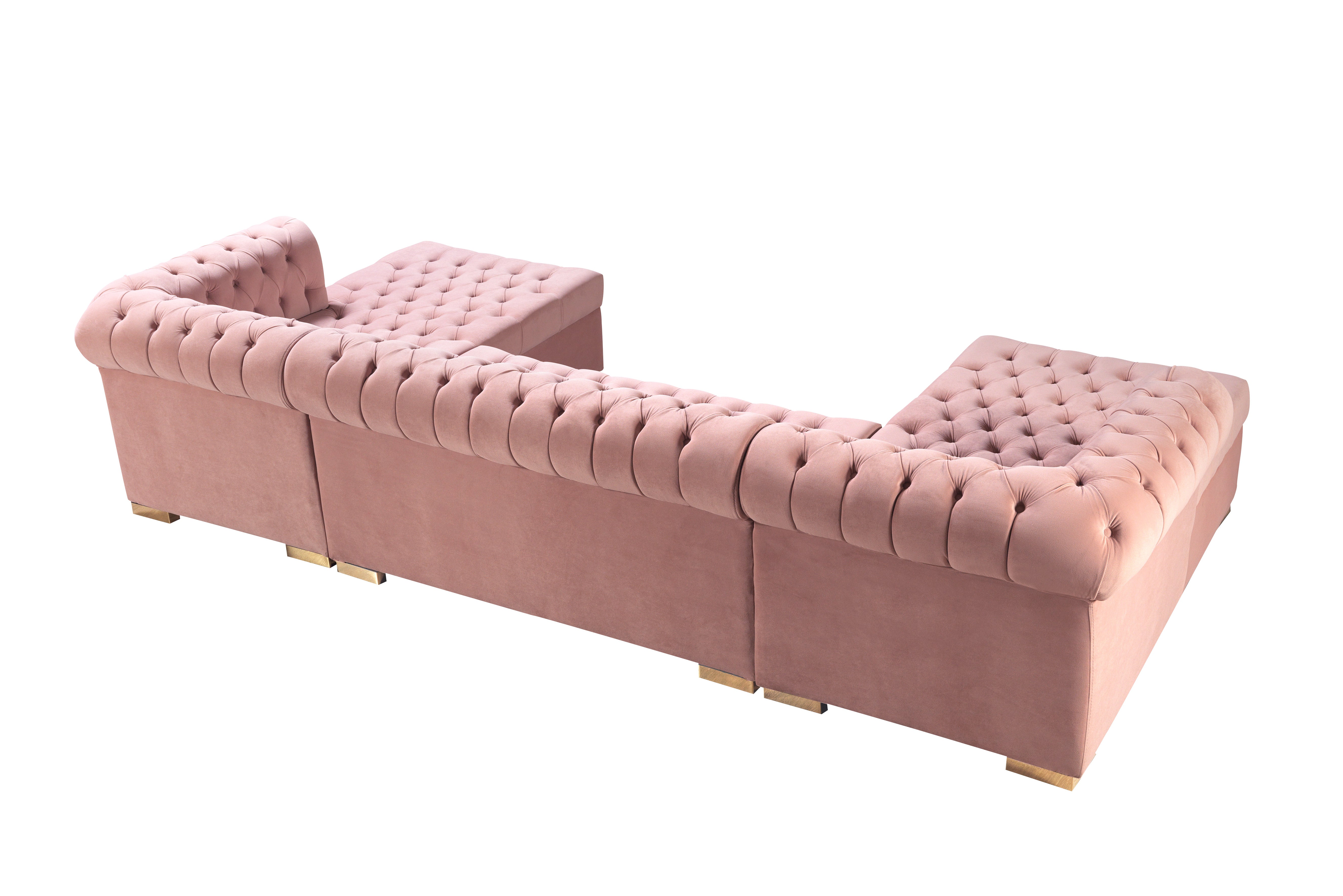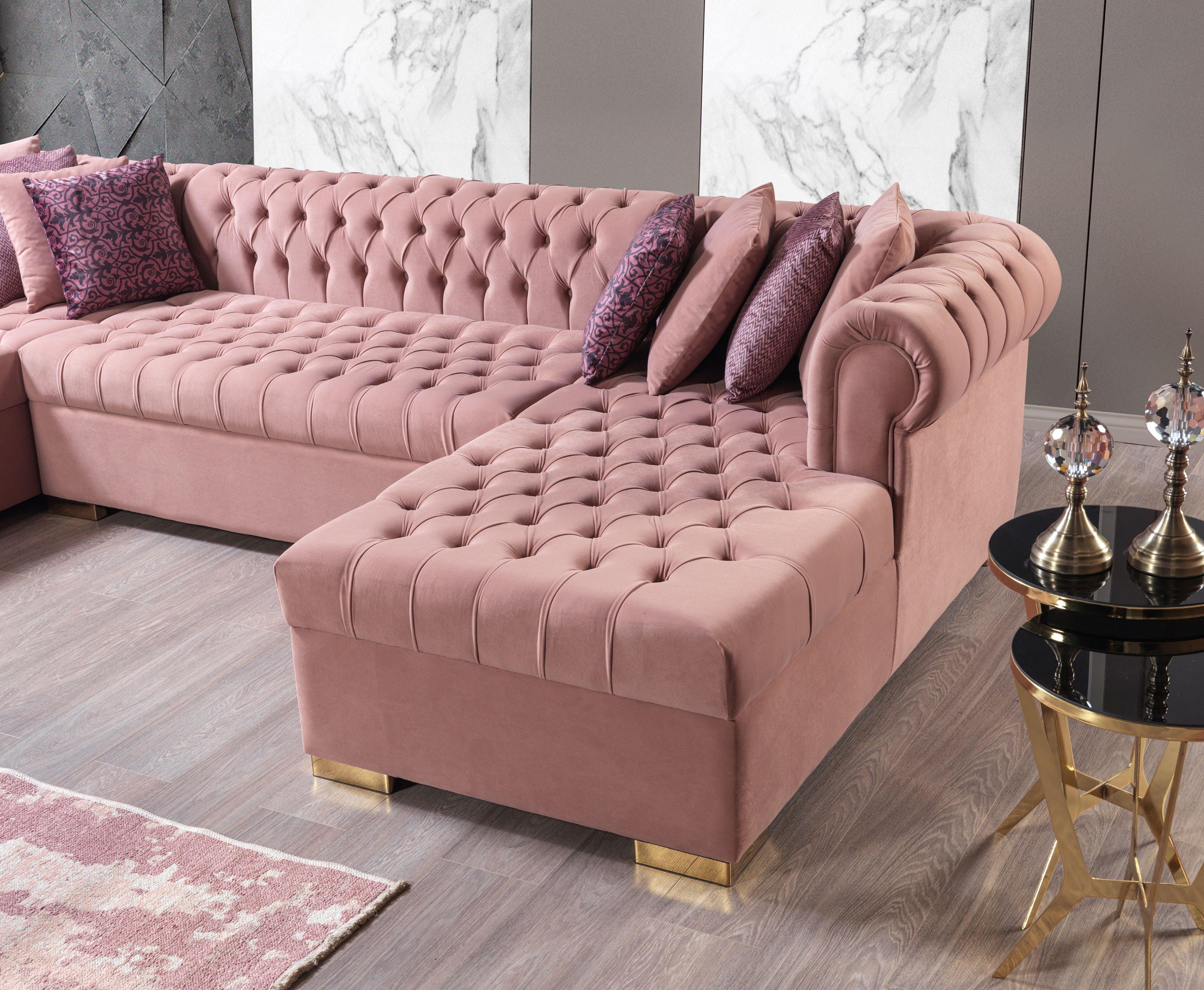 Experience the pinnacle of luxury seating with the Lauren Pink Velvet Double Chaise Sectional by Nova Furniture, an opulent centerpiece that transforms any living room into a glamorous sanctuary. The Lauren sectional invites you to stretch out, host lively gatherings, or simply relax with a book in hand. Its statement U-shaped, double chaise design offers abundant seating, while the plush velvet upholstery and deep tufting radiate classic elegance. Imagine hosting friends for sparkling evening cocktails, lounging with loved ones on movie nights, or creating a photogenic focal point for your next celebration—this sectional effortlessly adapts to your lifestyle, elevating both comfort and aesthetics. Designed for the discerning homeowner, the Lauren sectional’s quality craftsmanship ensures a balance of support, style, and durability. Luna Furniture introduces Lauren Pink Velvet Double Chaise Sectional to enhance the beauty of your living spaces.