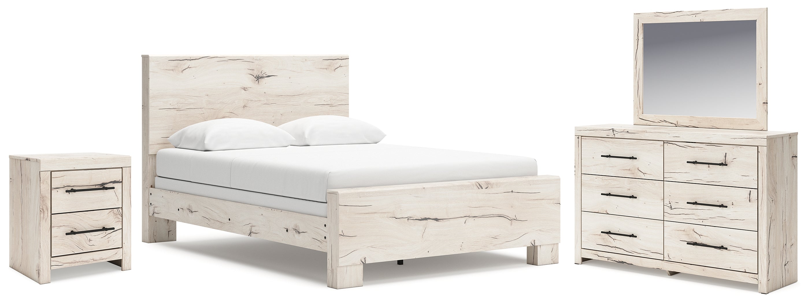 Lawroy Queen Panel Bed with Mirrored Dresser and Nightstand in Light Natural