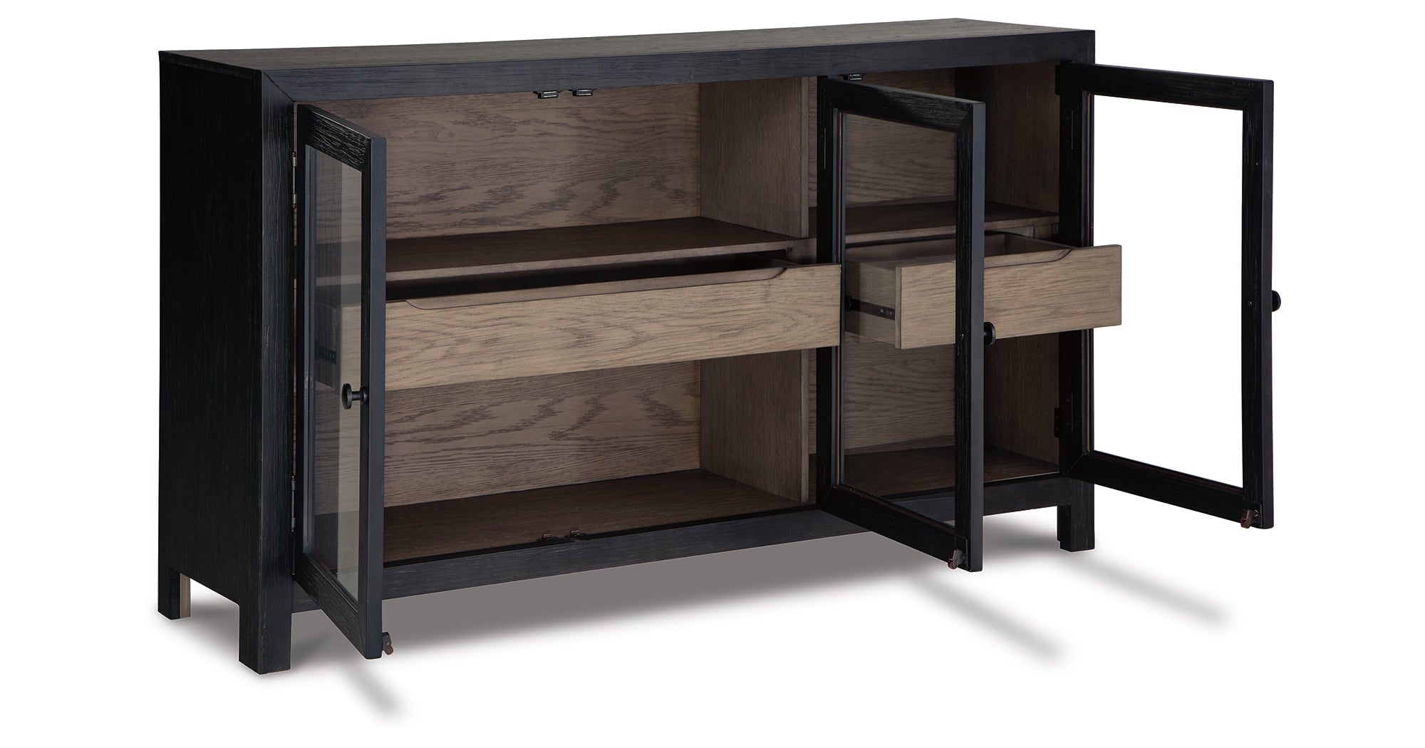 Add layers of form and function to your space with this accent cabinet. It's draped in a black finish on the outside and a warm gray finish inside, for a classic look that seamlessly transitions from casual to modern styles. This accent cabinet's flexible design includes three doors and two shelves for simple and streamlined storage. — Luna Furniture introduces Lenston Accent Cabinet to enhance the beauty of your living spaces.