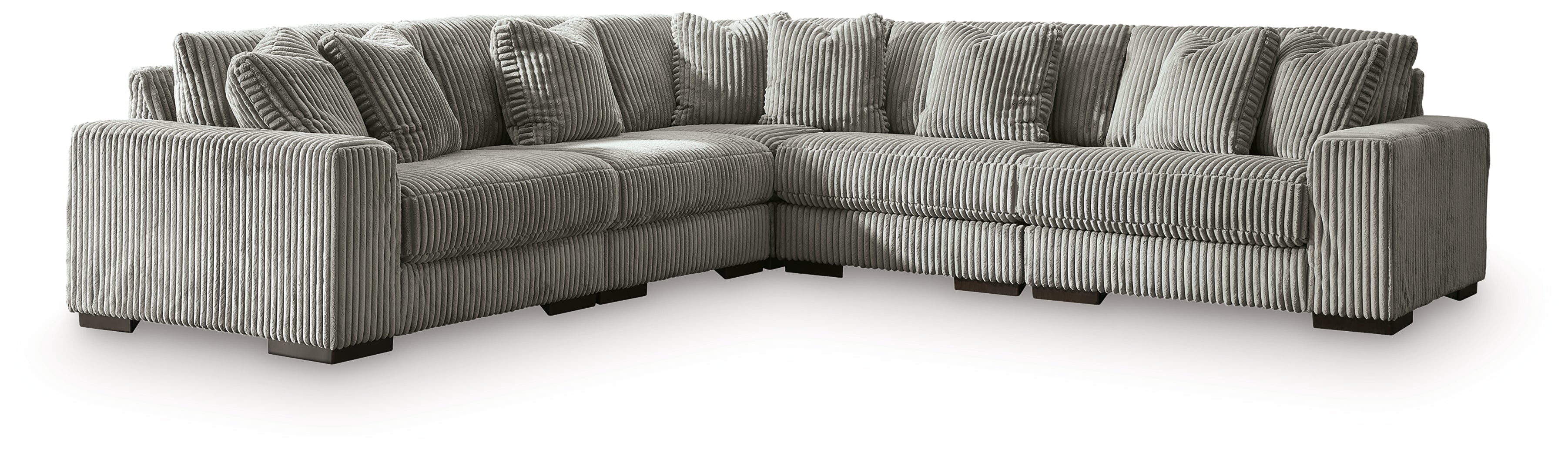 Plush and posh. Showcase your eye for on-trend texture with the statement-making cord upholstery of this sectional. Its stunningly soft fabric entices in a warm neutral hue, complementing contemporary color palettes. Sink into the cushions and plan to stay a while—this cozy living room centerpiece highlights your high-end approach to comfort and style. Luna Furniture introduces Lindyn 5-Piece Sectional to enhance the beauty of your living spaces.
