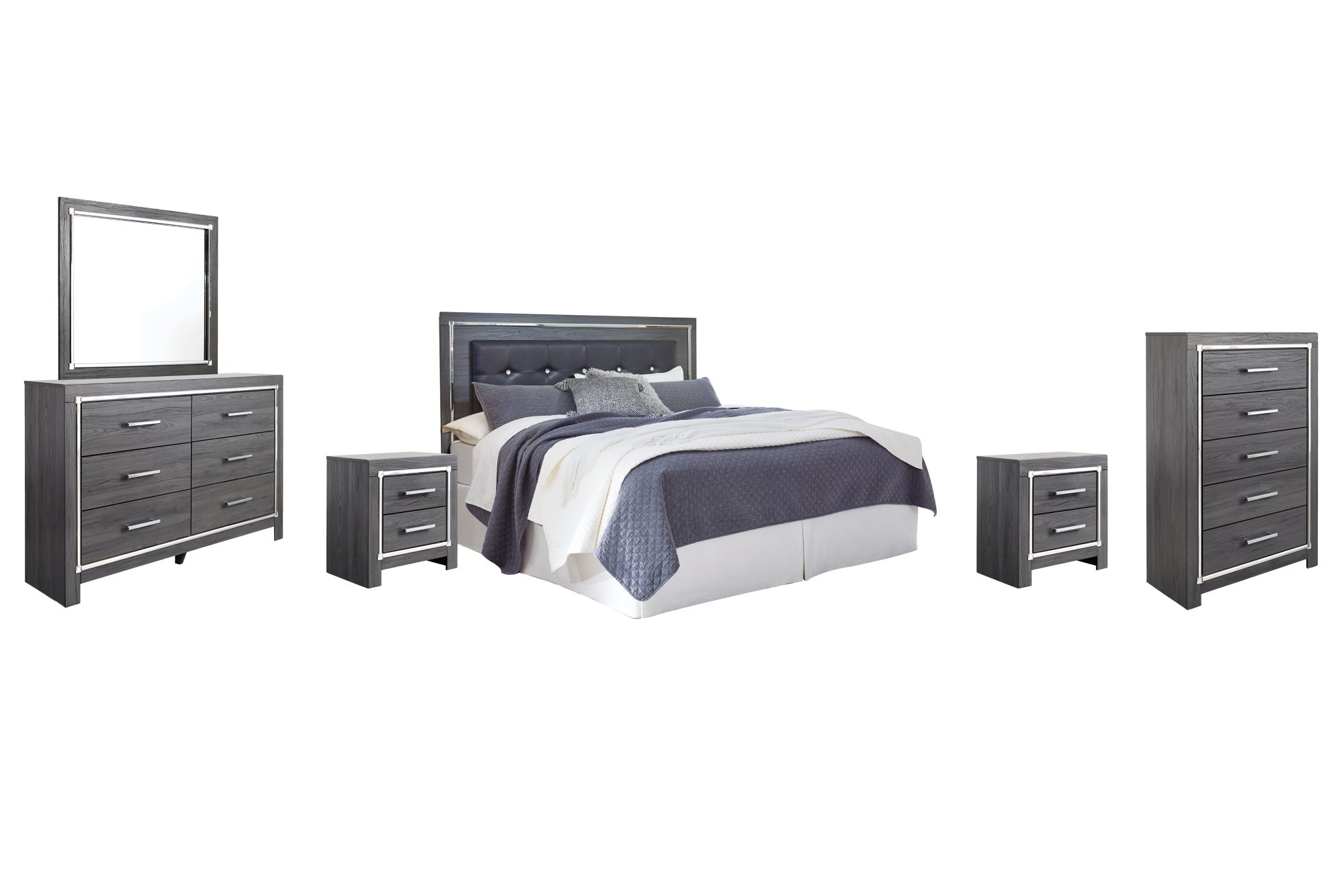 Lodanna King/California King Upholstered Panel Headboard Bed with Mirrored Dresser, Chest and 2 Nightstands in Gray