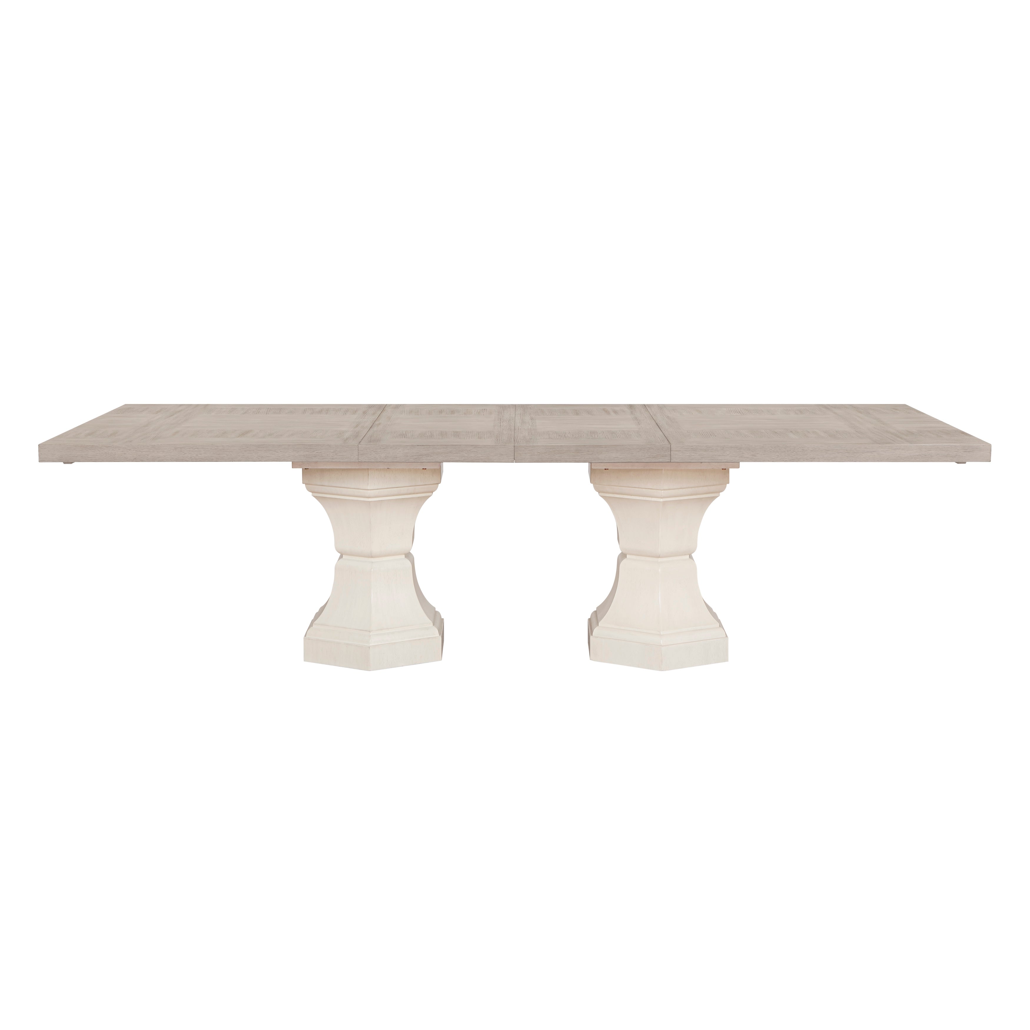 Elevate your dining experience with this versatile and stylish extendable dining table, featuring a chic two-tone light gray and white finish. Crafted from durable oak veneer, wood, and engineered wood, this table is built for lasting beauty and functionality. Perfect for both everyday meals and larger gatherings, it effortlessly expands to comfortably seat up to 8 guests thanks to its two separate extension leaves. Simply pull both ends and drop in the leaves to transform your dining space. This modern table combines contemporary design with practical adaptability, making it an ideal centerpiece for any dining room. Assembly is required.