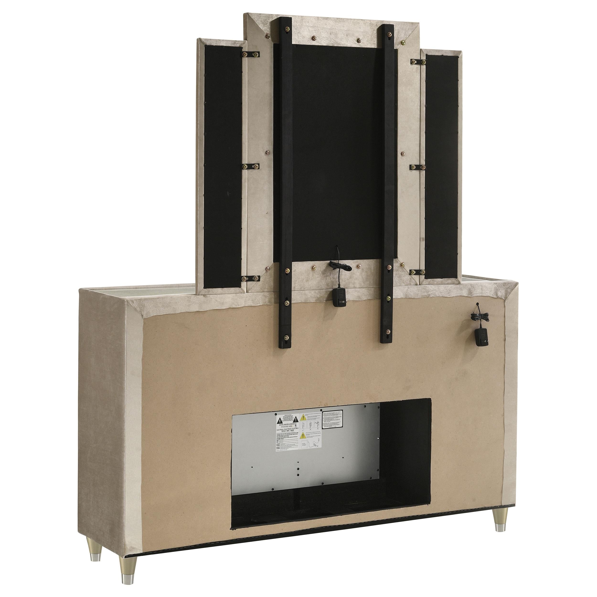 Warmth meets radiance in this dresser and mirror set, where ivory and camel velvet surround every surface. A built-in flame visualizer sits beneath a clear tempered glass top, with LED case lighting adding atmosphere. The tri-panel mirror features LED illumination to complete the glow. Finished with crystal knobs, quilted velvet fronts, and felt-lined drawers, this set pairs soft elegance with practical brilliance, all lifted by acrylic legs.