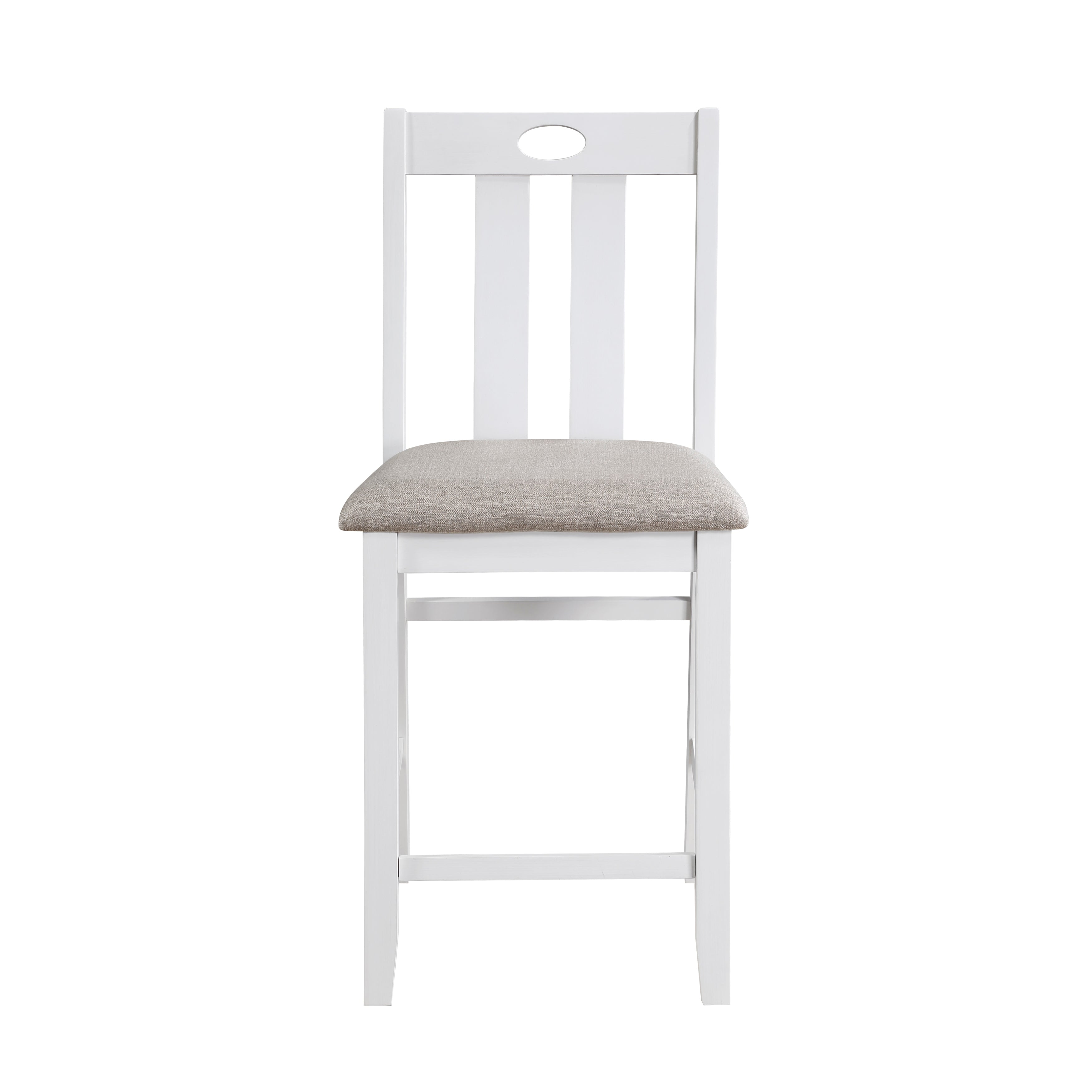 The two-tone finish of the Lowell Collection pairs a bright white finish and weathered gray, over oak veneer, creating a striking combination perfect for your home’s casual dining space. The counter-height dining group is conveniently packaged to include a table and four coordinating chairs. The seats of the chairs are covered in light gray fabric for complementing contrast to the collection’s finish.
