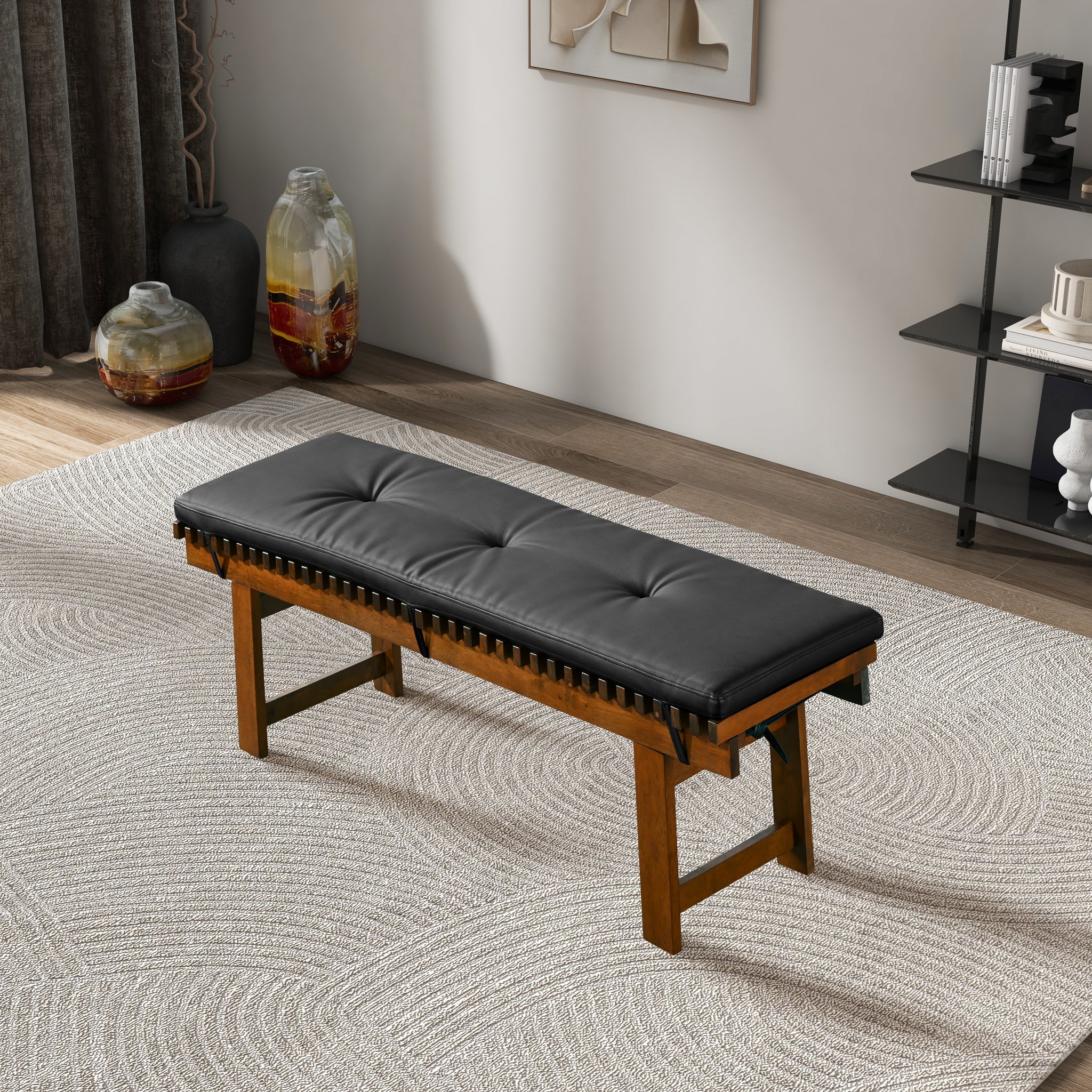 Elevate your space with our Mid-Century Modern Solid Wood Dining Bench, designed with elegant vegan leather upholstery. Crafted from durable rubber wood with a refined walnut finish, this bench adds a touch of sophistication to any room. The comfortable, stain-resistant vegan leather cushion is perfect for pet-friendly homes. Seating two, it's ideal for dining rooms, living areas, bedrooms, or entryways and supports up to 400 lbs.