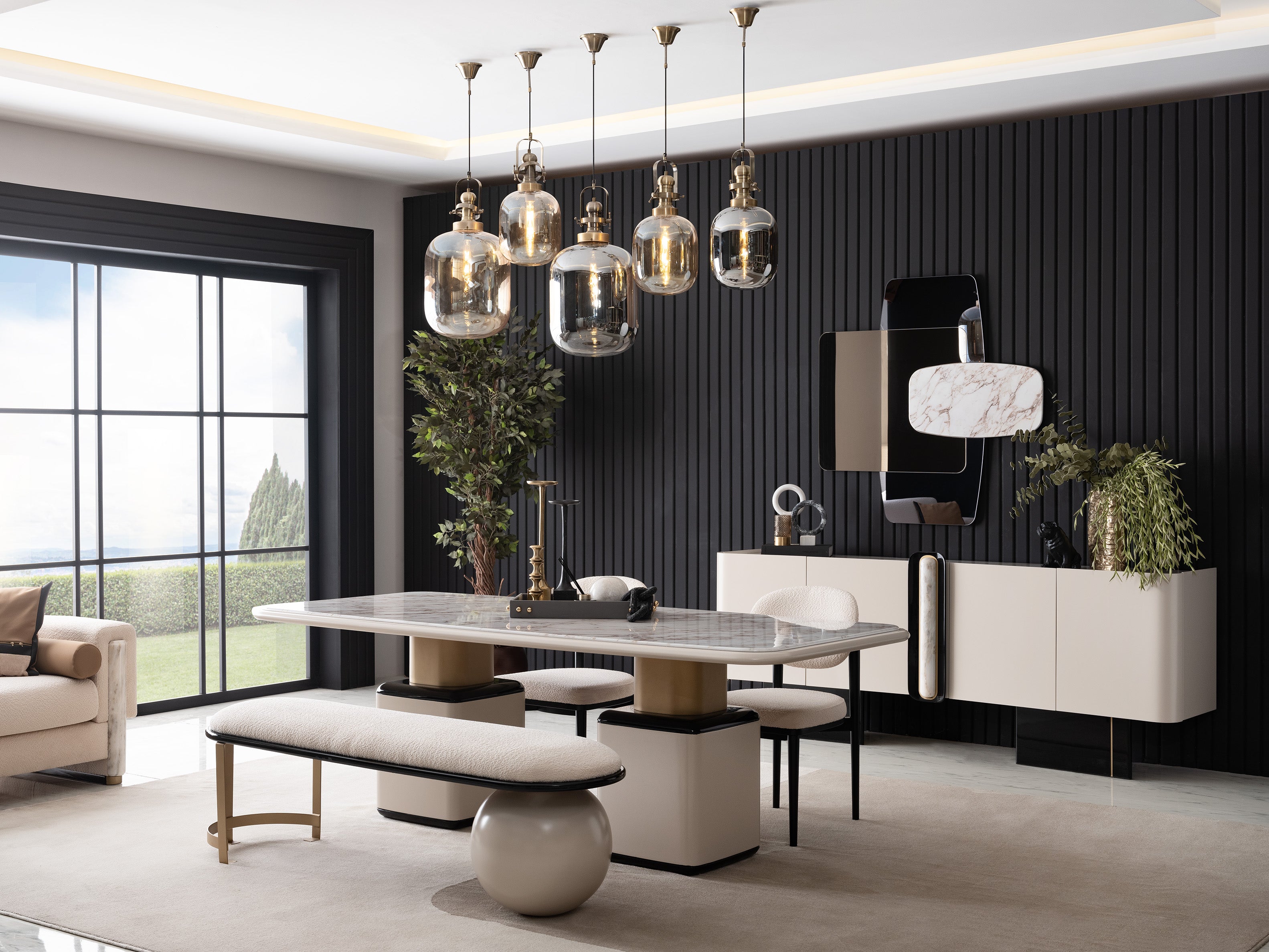 The Luciano Dining Table embodies the essence of luxury and modern sophistication, offering a seamless blend of opulence and contemporary aesthetics. Crafted with an exquisite marble tabletop and supported by statement-making geometric bases, this dining table becomes the focal point of any refined dining space. Its smooth, rounded edges add a touch of elegance, while its sturdy construction ensures both beauty and durability.