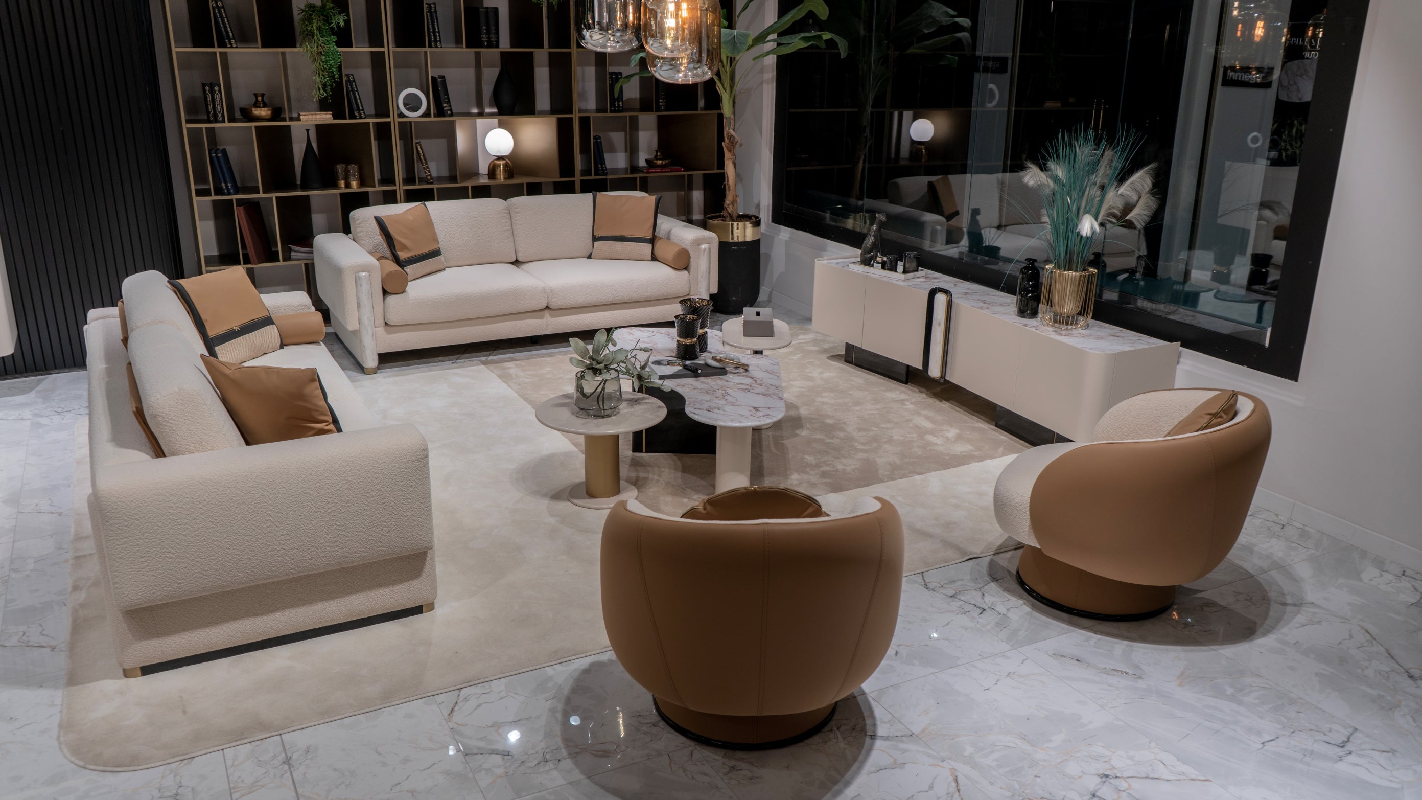 - Color Options: Neutral cream fabric with warm tan leather accents