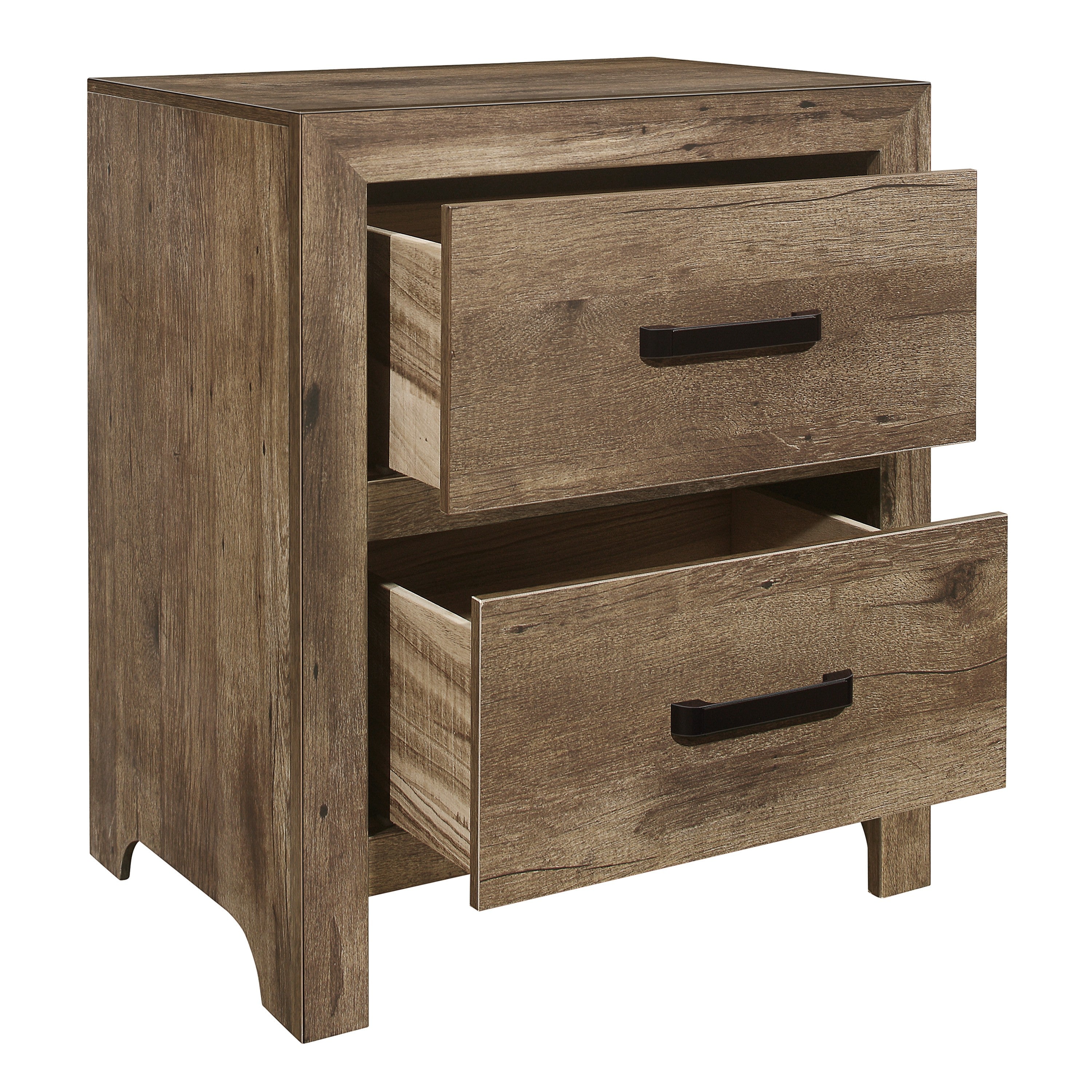 The modern lines of the Mandan Collection are blended with transitional aesthetic to create a unique offering for your bedroom. Utilizing faux wood veneer creates the look of authentic wood planks with the weathered pine finish further lending to the rusticated style. Black finished nickel bar hardware fronts each drawer providing contrasting complement to the nightstand.