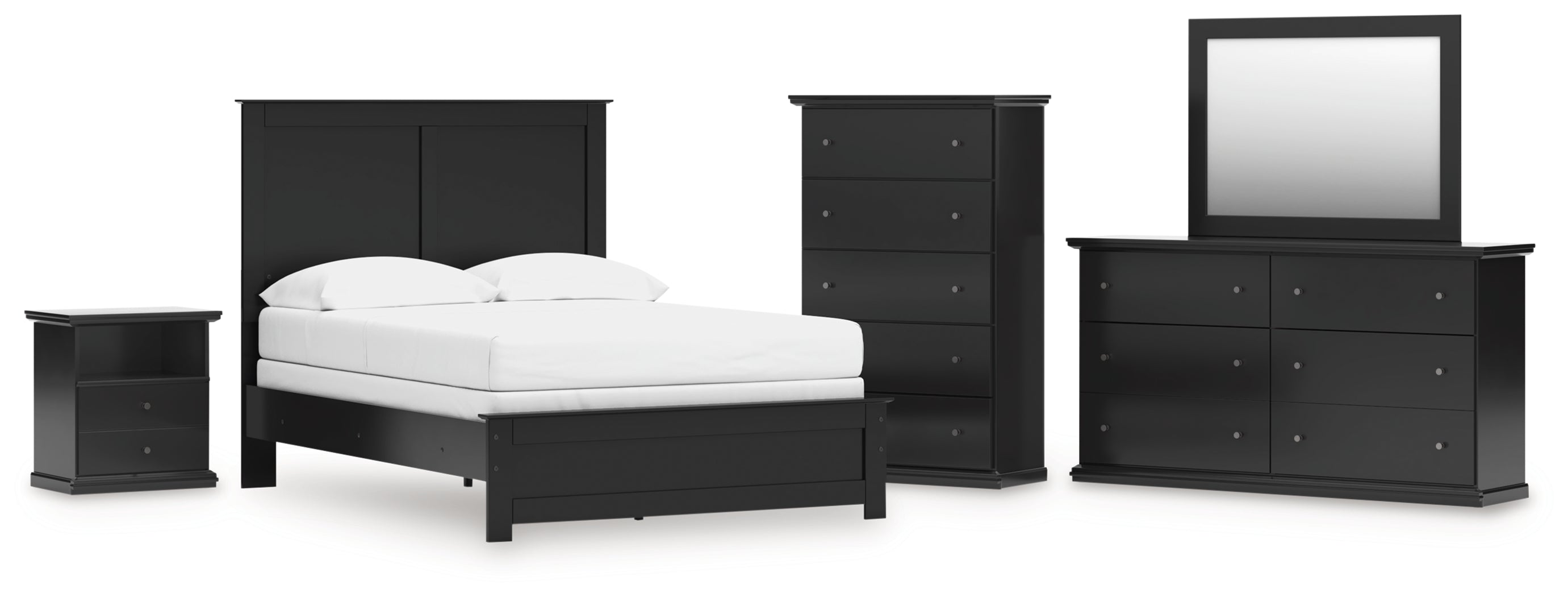 Maribel Full Panel Bed with Mirrored Dresser, Chest and Nightstand in Black