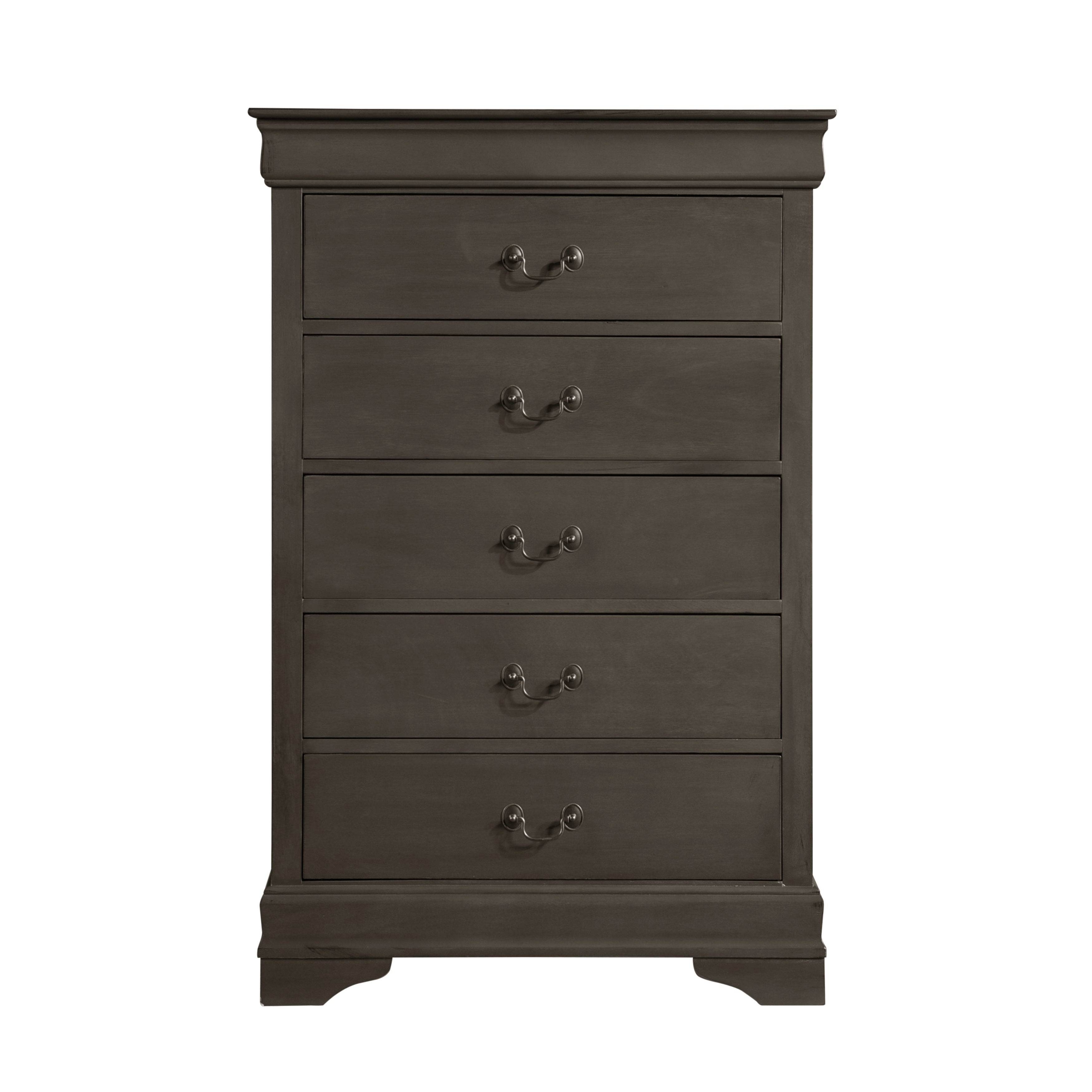 Traditional in design and modest in scale, the elegant Mayville Collection takes its design inspiration from the classic Louis Philippe styling. The Okume veneer of the chest is paired with a stained gray finish and is accentuated by antique brass tone drop handles.