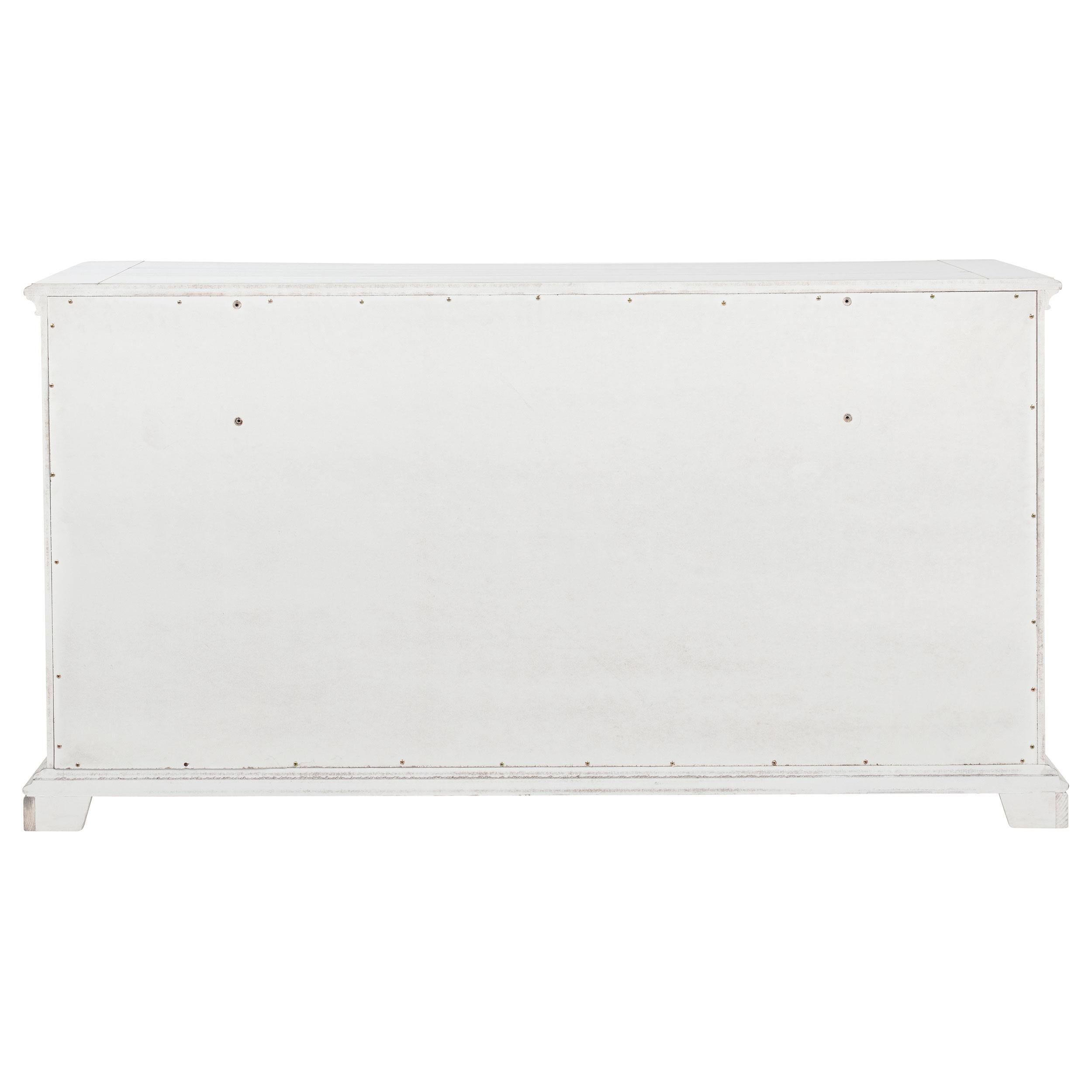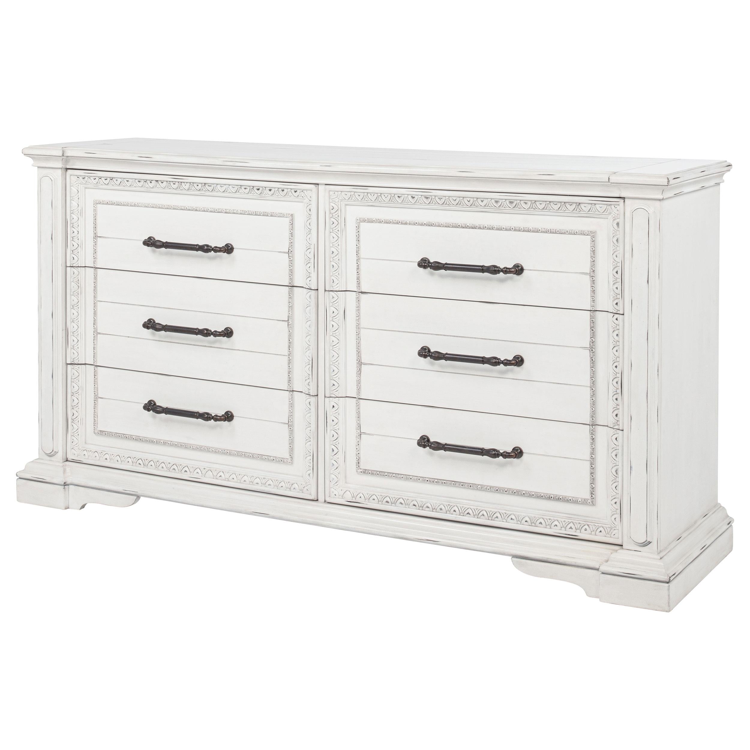 Classic and composed, this six-drawer dresser blends traditional design with elegant practicality. Its vintage white finish is gently distressed, accentuating ornate trim and antique bronze drawer pulls. A hidden jewelry tray tucked into the bottom drawer adds a thoughtful touch, while spacious drawers offer smooth functionality. Crafted from poplar and engineered wood, it brings heritage-inspired charm to any bedroom.