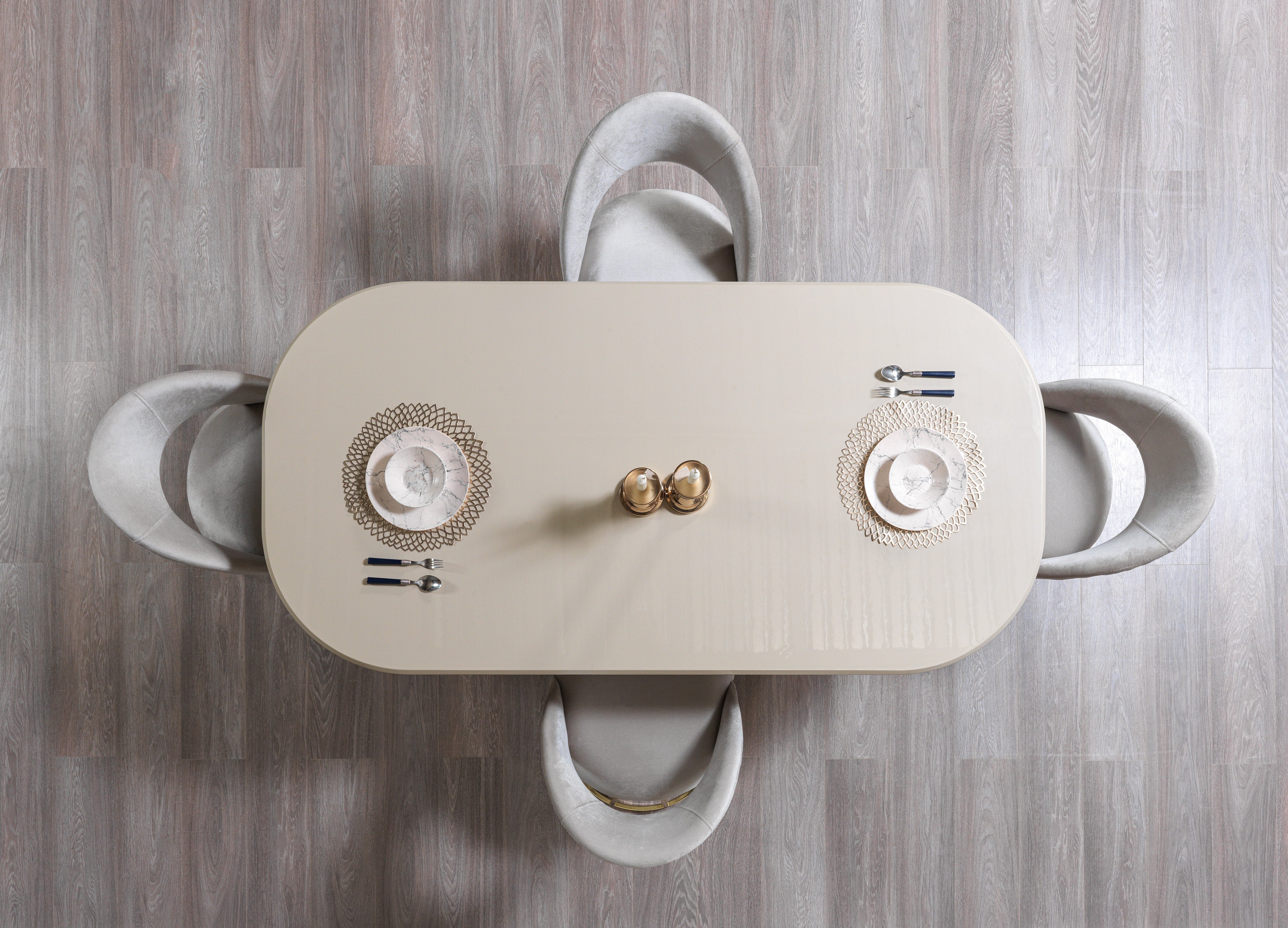 • Elegant High-Gloss Tabletop: The table’s smooth, polished surface heightens the room's brightness and visual allure, creating a sophisticated focal point for your dining room.