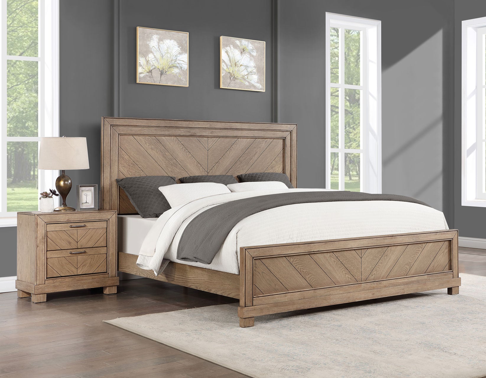 Relaxed and rustic, the Montana Queen bed brings casual style to today’s bedroom. A neutral soft gray finish complements most interiors with a primitive design that offers simple sophistication with details like a framed Chevron patterned Headboard and Footboard. Whether in the guest room or the Master Bedroom, Montana dresses up a bedroom without making it stuffy.