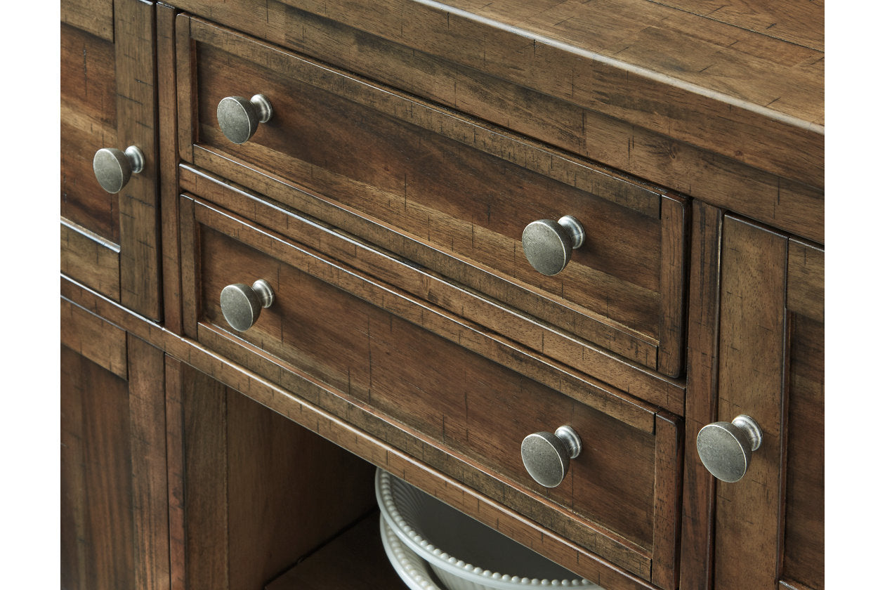Moriville Grayish Brown Counter Height Dining Table with 4 Barstools, Bench, and Server