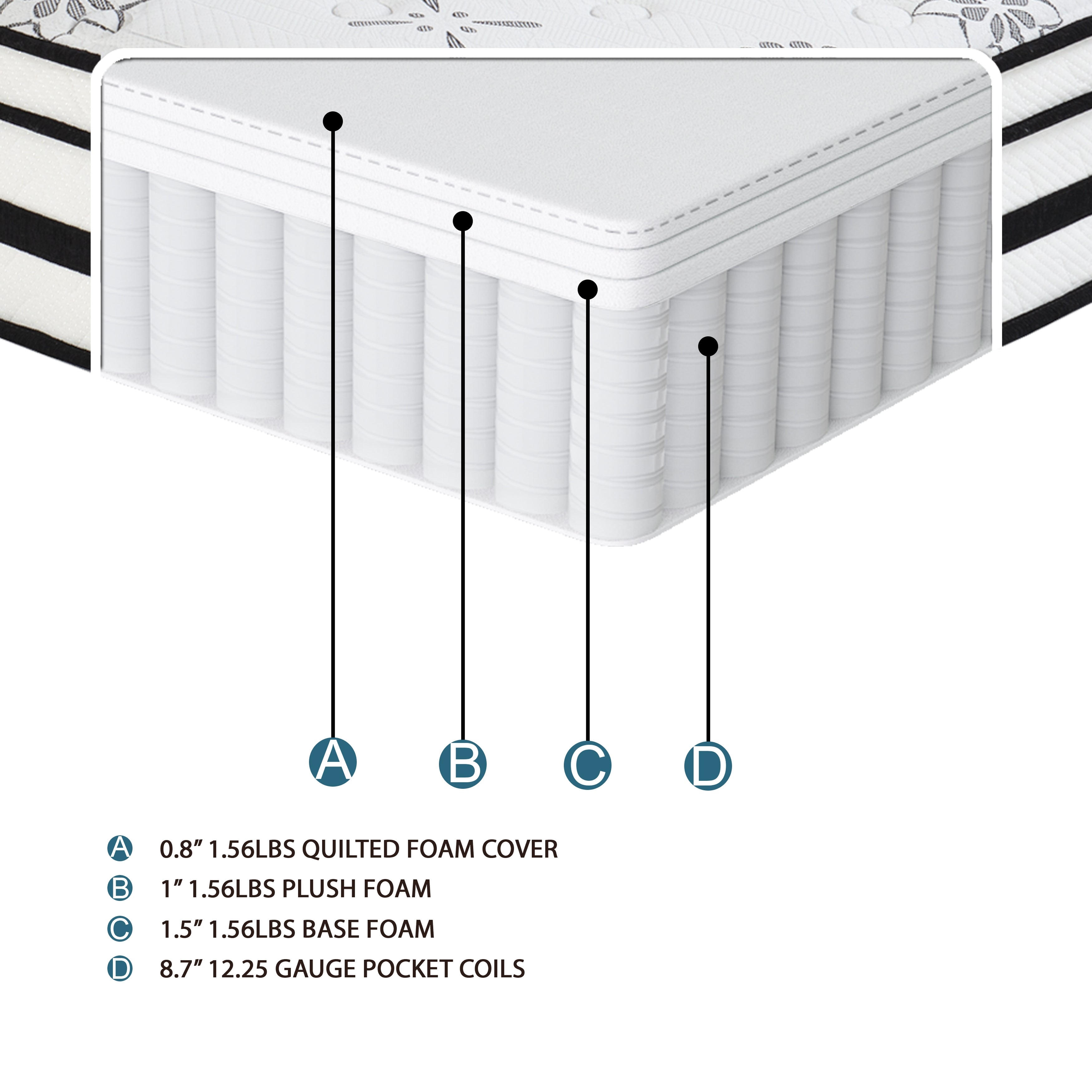 The Vela Collection presents our Promo Hybrid mattress that forms to your body, creating a customized sleep experience that is as unique as you are. The fabric covering the Full mattress is breathable, which allows for a comfortable night’s sleep no matter the season. Our 12-inch mattress features a four-layer construction that consists of: 0.8-inch quilted cover which contains green tea extract for freshness, 1-inch of super soft foam, 1.2-inch of super soft convoluted foam, 8.7 –inch 14/13 gauge pocket coil unit and two 0.15-inch isolated pads. Our Promo Hybrid is suitable for an adjustable base. The Vela Collection creates the perfect fit for your personal sleep experience.