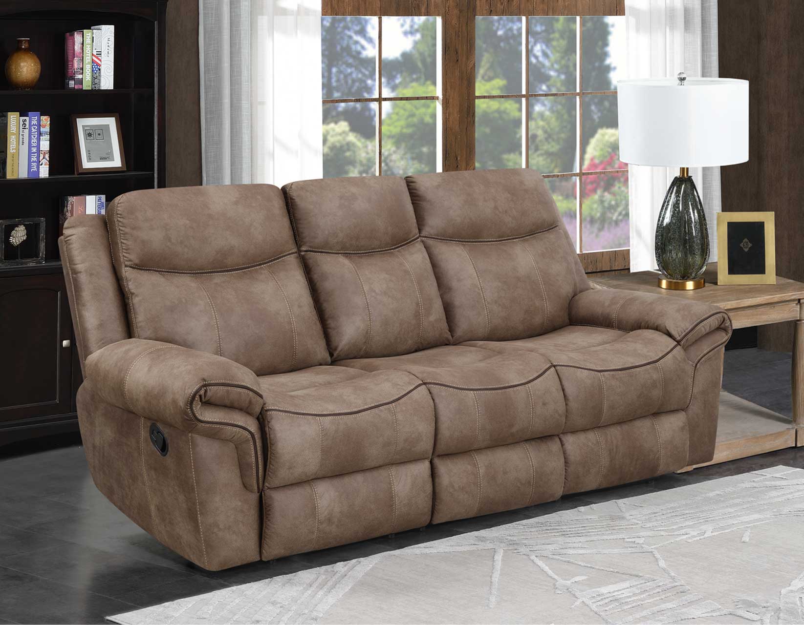 The Nashville Cocoa Sofa with Drop-Down Console brings incredible comfort and function to any room. Generously scaled to seat three when closed, the center seat back has a feature-packed Drop-Down Console with work surface, two cupholders and a pop-up power strip with USB charging and electrical outlets. Never miss the action again looking for a charging station for your devices. The faux-suede cover offers a warm soft-to-touch cover with generously scaled folded cushion arms that add ample padding to the decadent seat cushioning for a relaxing reclining experience.