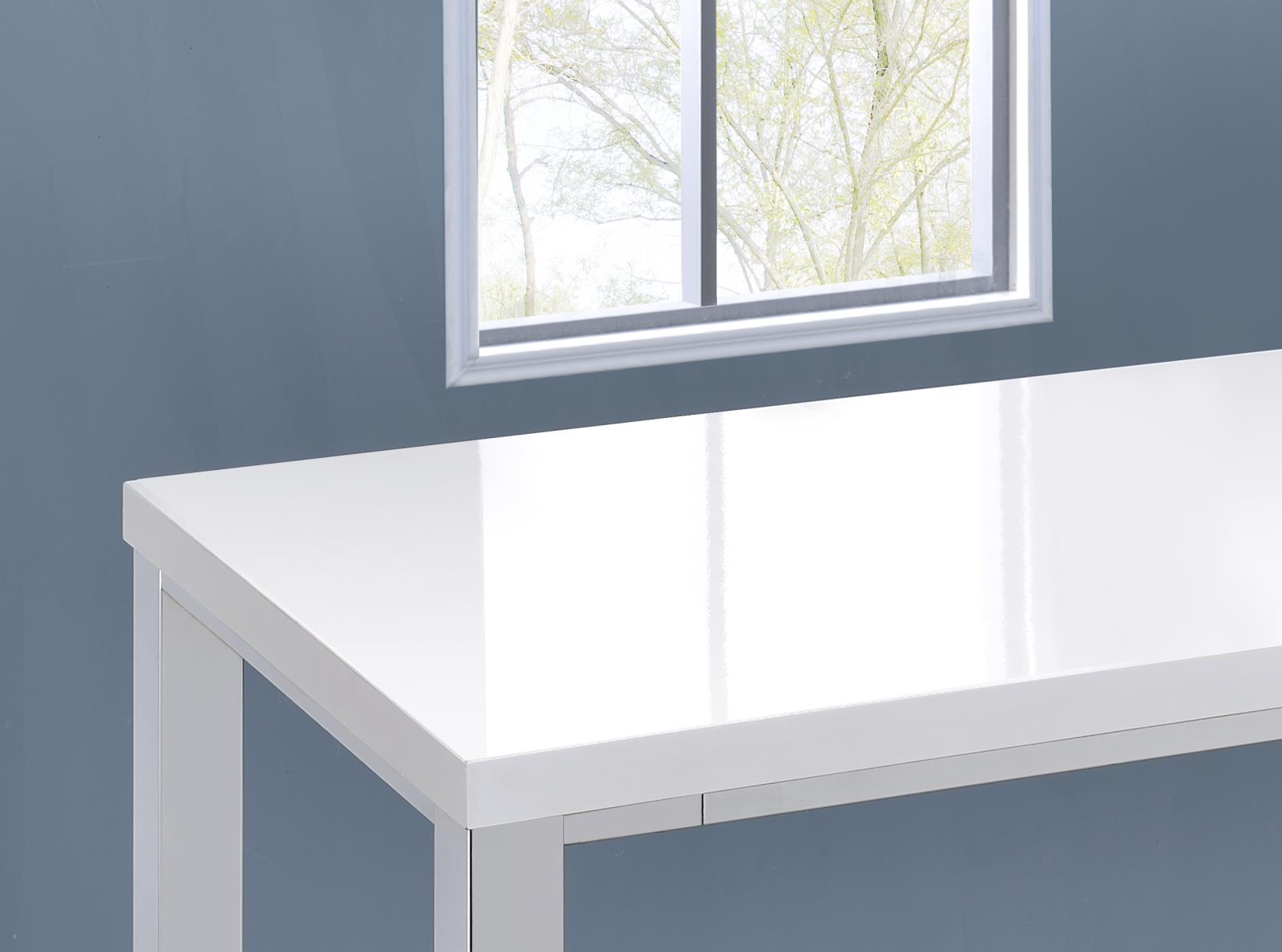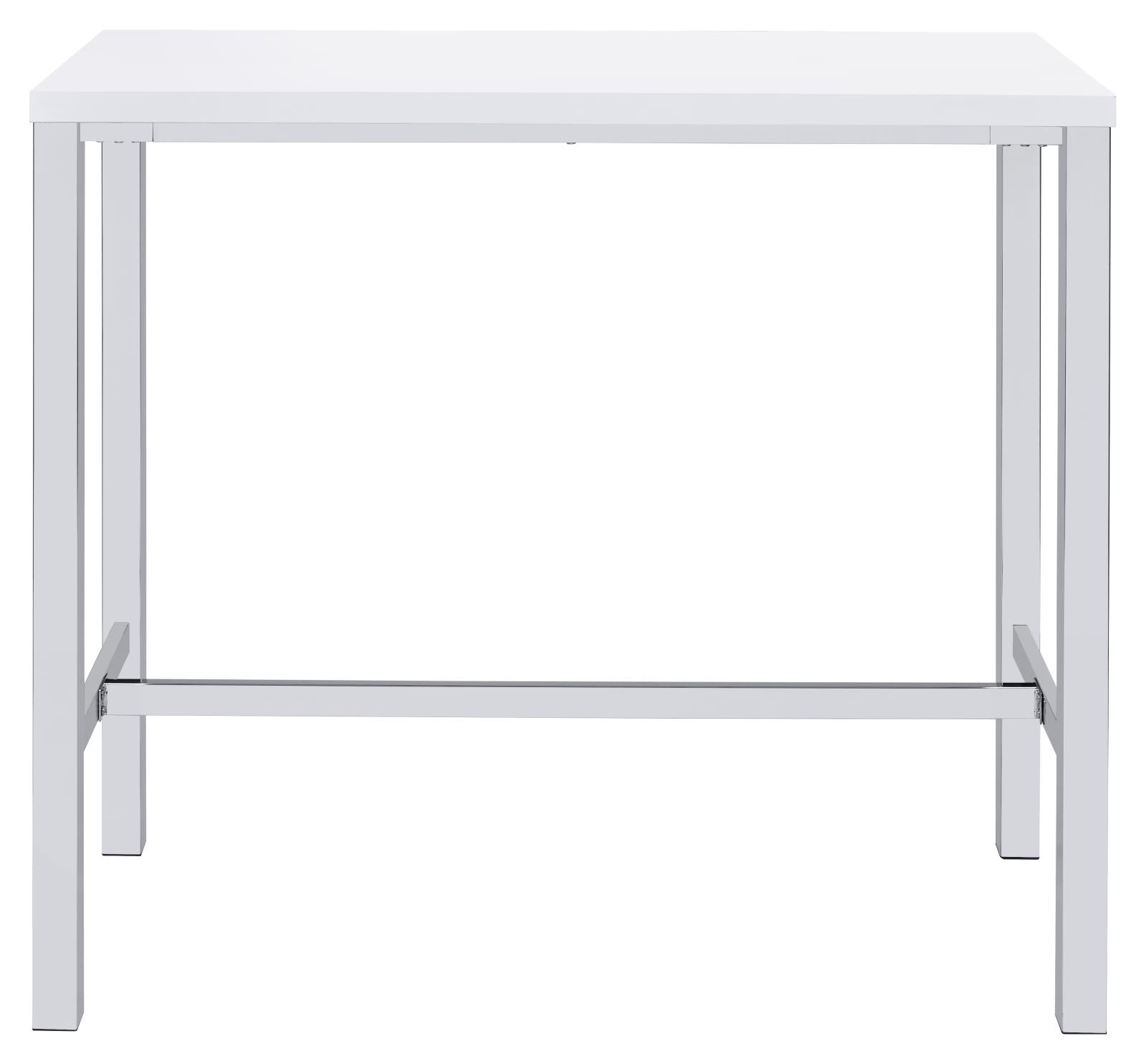Ultra-modern with a clean lined silhouette, this five-piece bar set comes complete with a rectangular shaped bar table and four bar stools. Perfect for more contemporary home, the table comes with sleek and square legs made and a steel frame in an electroplated and polished chrome finish that lends a luxurious gleam to any room. The tabletop features a high gloss white lacquer finish and seats four people comfortable. Each stool also features a matching lustrous high gloss white seat and matching legs. One the stools are also footrests for extra support and stability.