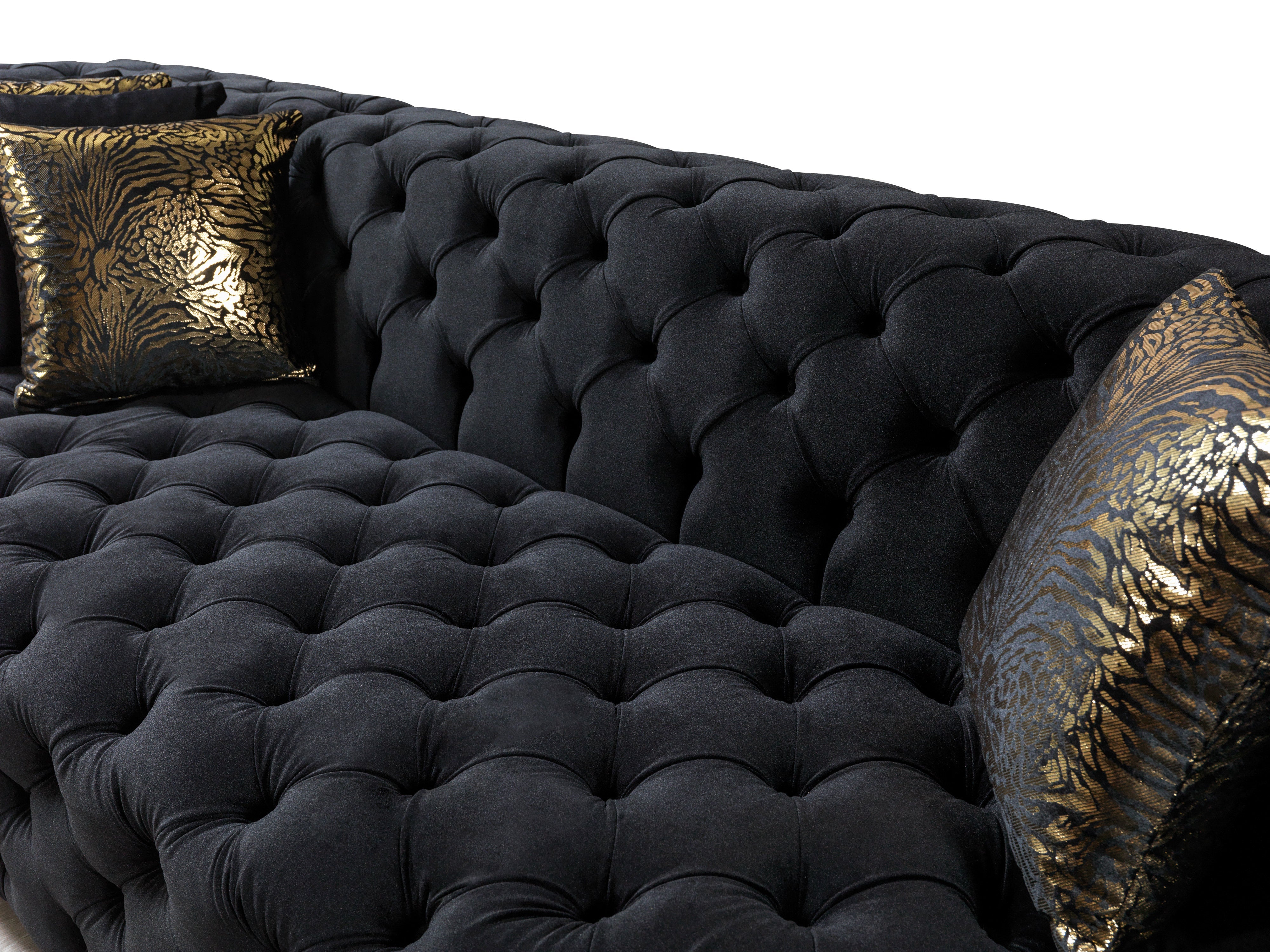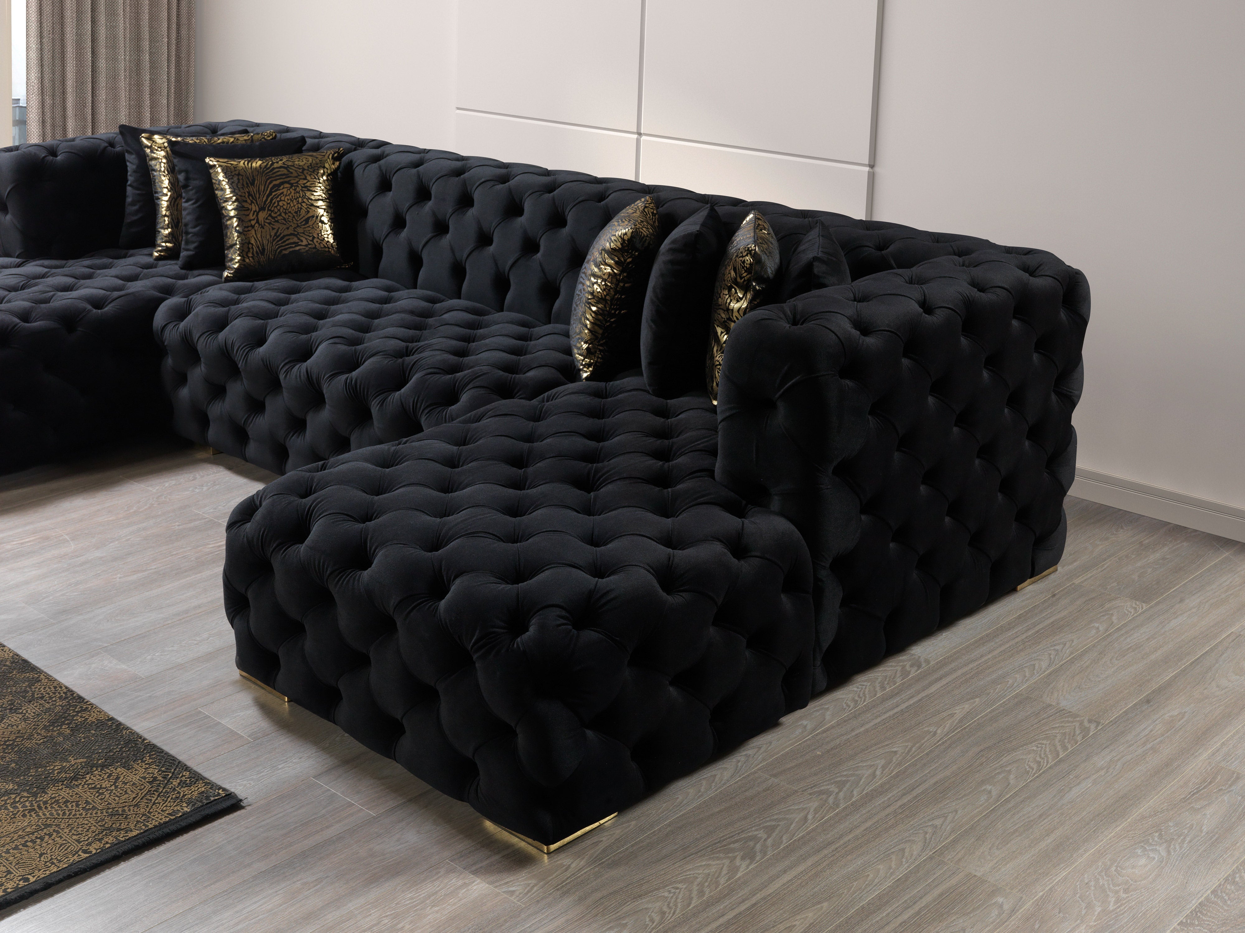 The Neva Black Velvet Double Chaise Sectional is perfect for modern luxury homes, open plan apartments, or anyone seeking a dramatic, high-end centerpiece for their living space. Each detail celebrates artisan craftsmanship—from its expertly tufted velvet to its solid hornbeam wood frame and elegant metallic accents. Transform your living room into a glamorous haven that never goes out of style, and enjoy years of sumptuous comfort and striking presence with the Neva sectional from Nova Furniture.