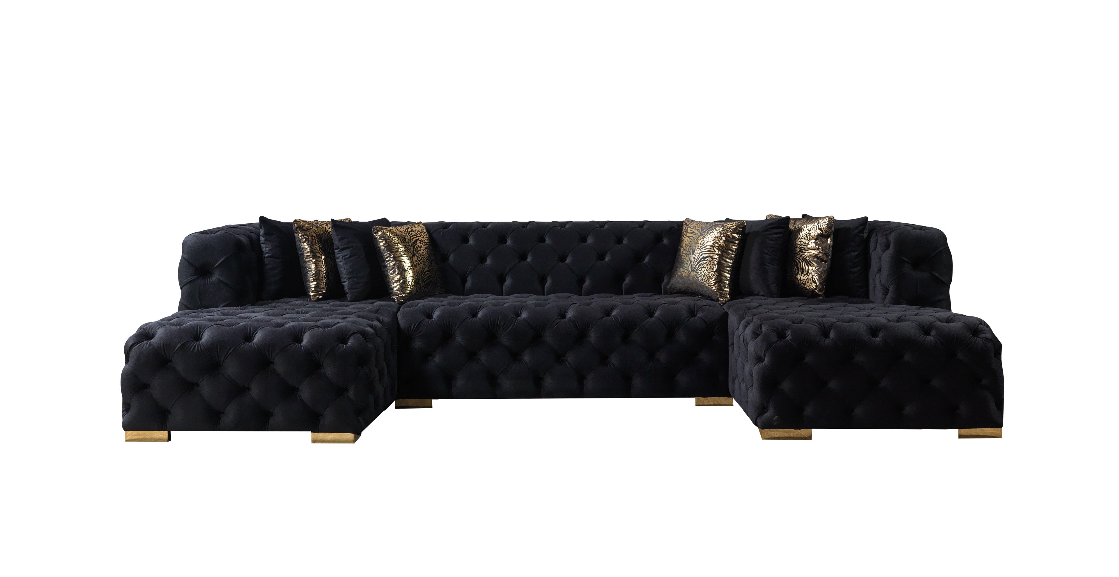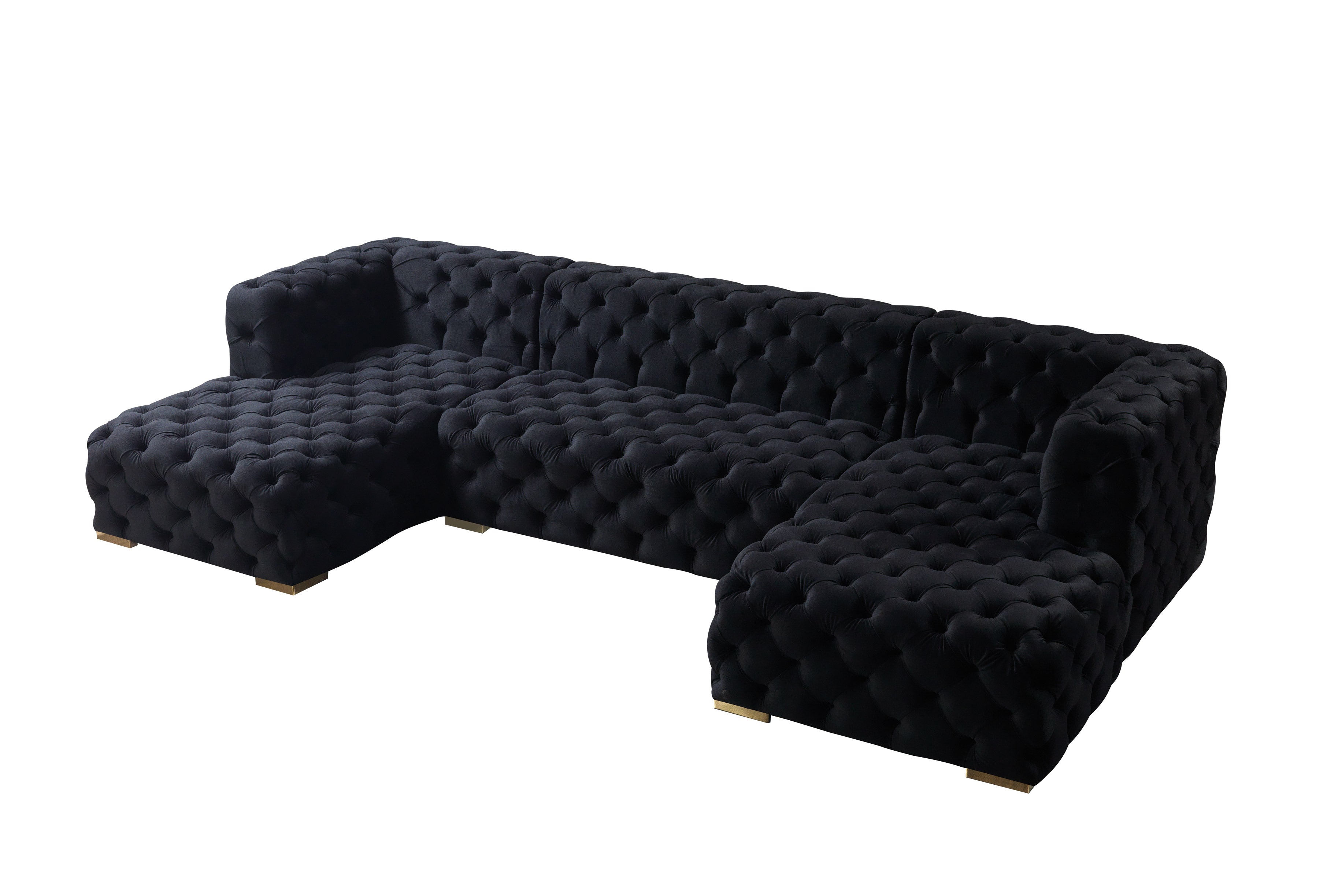 The Neva Black Velvet Double Chaise Sectional is perfect for modern luxury homes, open plan apartments, or anyone seeking a dramatic, high-end centerpiece for their living space. Each detail celebrates artisan craftsmanship—from its expertly tufted velvet to its solid hornbeam wood frame and elegant metallic accents. Transform your living room into a glamorous haven that never goes out of style, and enjoy years of sumptuous comfort and striking presence with the Neva sectional from Nova Furniture.