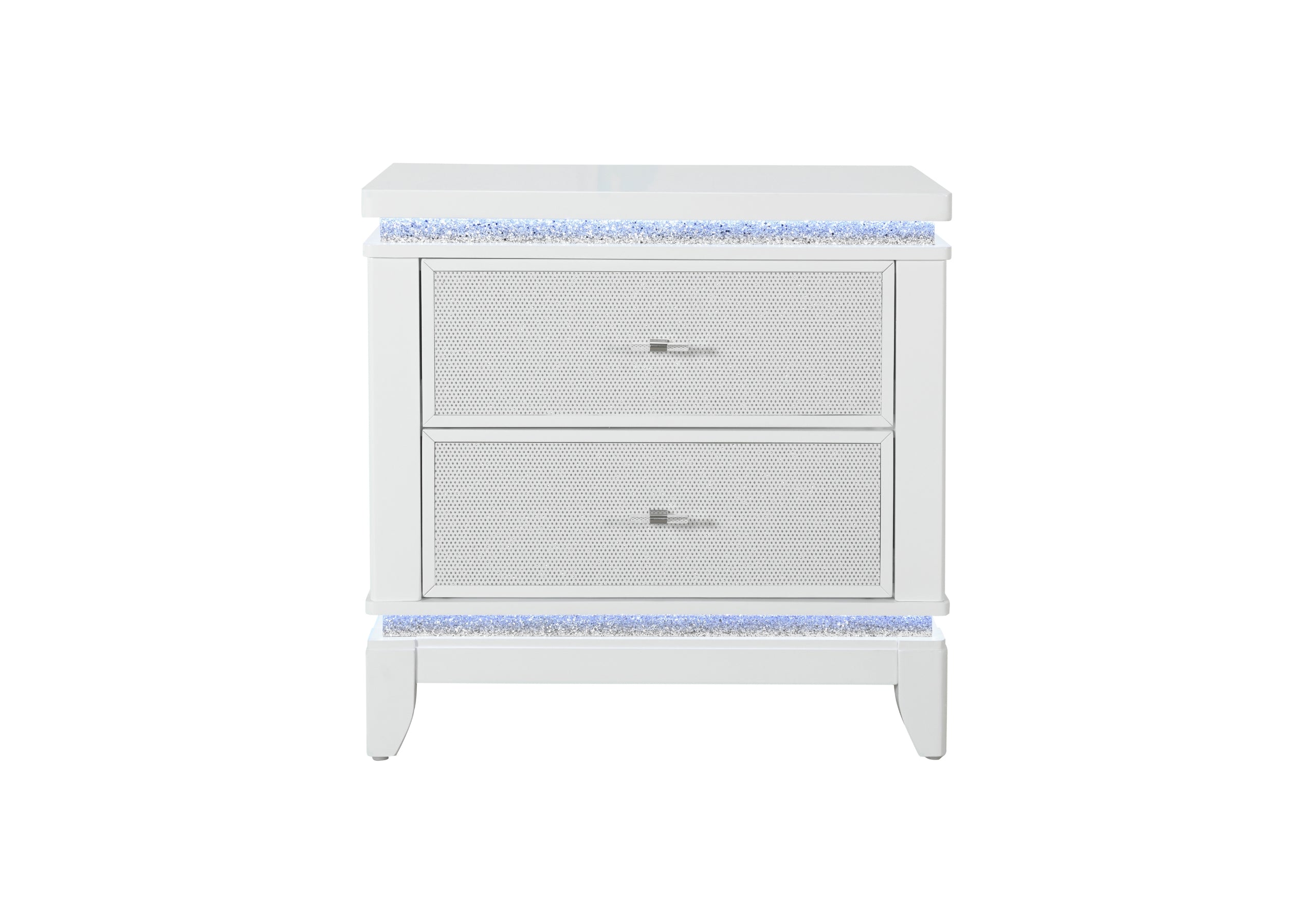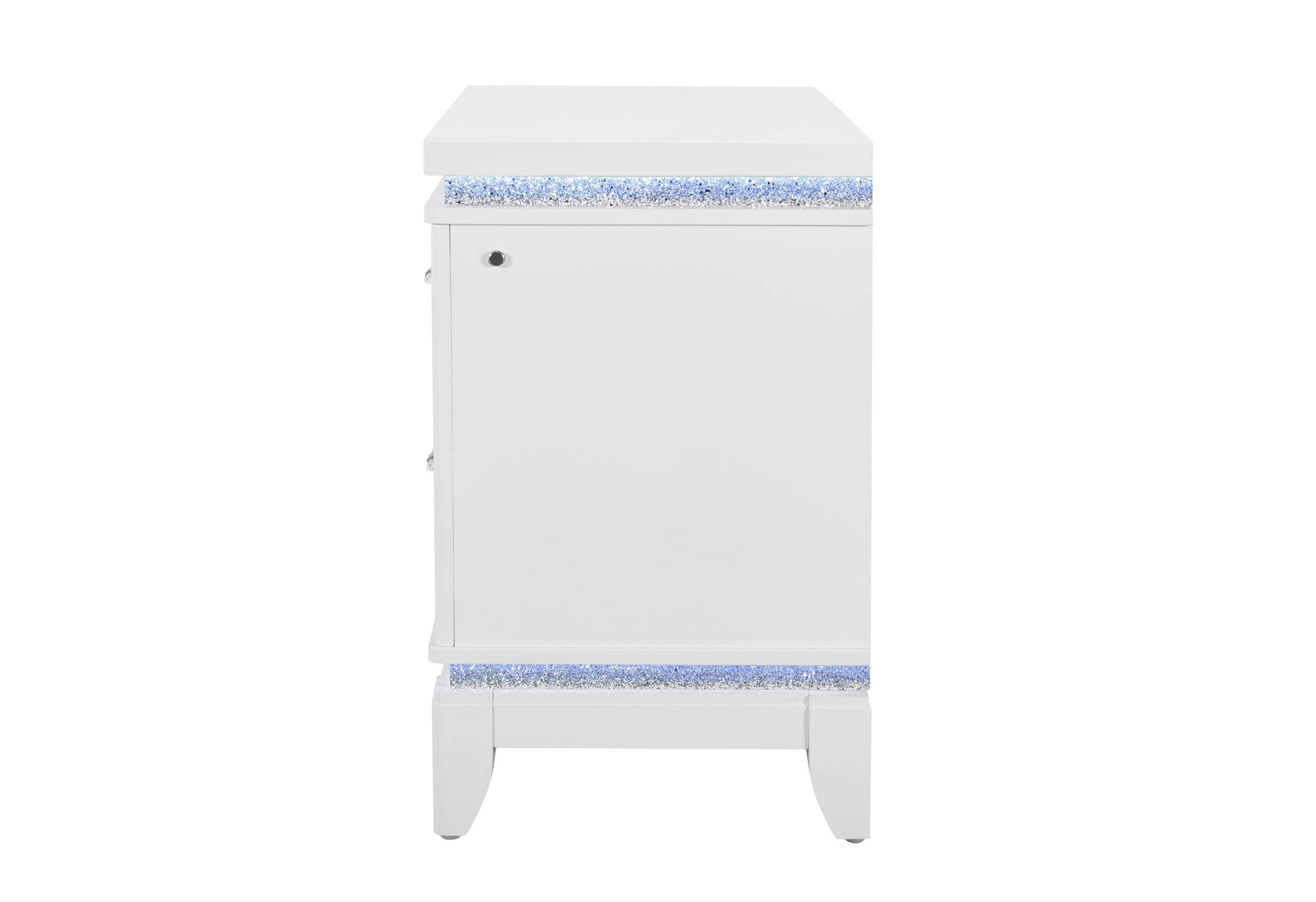 The Alina Nightstand is the perfect bedside companion, offering convenience and glamour in equal measure. With LED lighting and crushed glitter surfaces, it’s a nightly spectacle, while the silver glam drawer fronts ensure your essentials are housed within reach, and in grandeur.