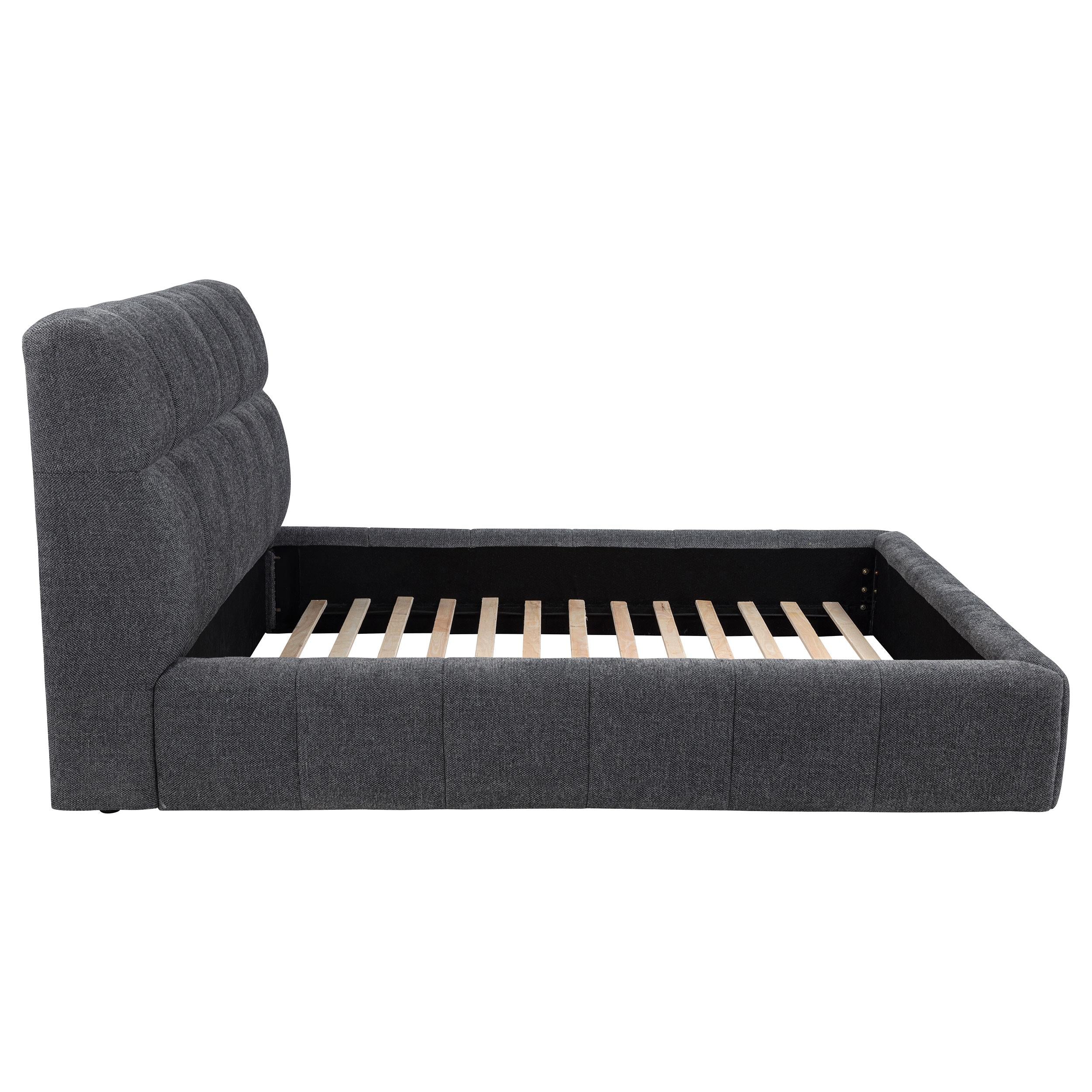 Tailored with bold lines and soft texture, this upholstered platform bed blends comfort with quiet strength. Vertical channel tufting runs along the headboard and foot rails, adding dimension and rhythm to the silhouette. Wrapped in plush fabric and fully slatted for support, it eliminates the need for a foundation. Crafted from solid and engineered wood, this bed invites modern serenity into any bedroom retreat.