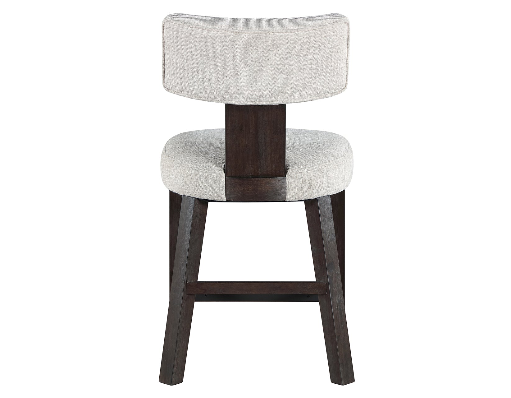 Bring style and comfort to your kitchen or dining space with the Oakley 5-Piece Counter Set. The 60″ counter-height table features hidden storage with dual doors and a shelf—perfect for keeping dining essentials close. Finished in a rich charcoal brown, the table’s rounded corners and cove bullnose edge add a modern touch. Four counter stools offer plush comfort with upholstered barrel-style backs and cushioned seats in light gray herringbone fabric. Designed for everyday living, Oakley blends casual elegance with lasting durability.