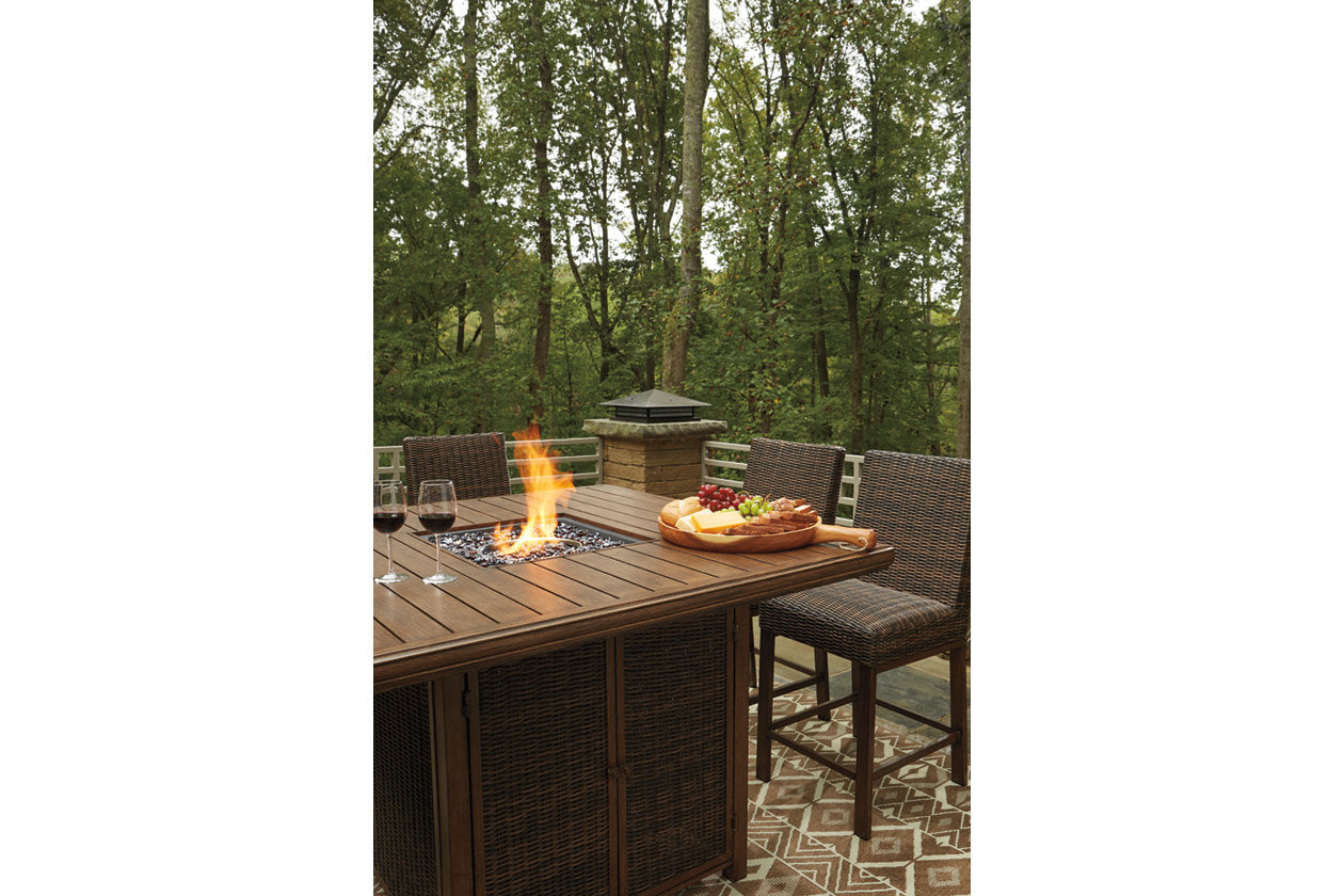 - Item Name: Paradise Trail Outdoor Bar Fire Pit Table with 6 Barstools by Ashley