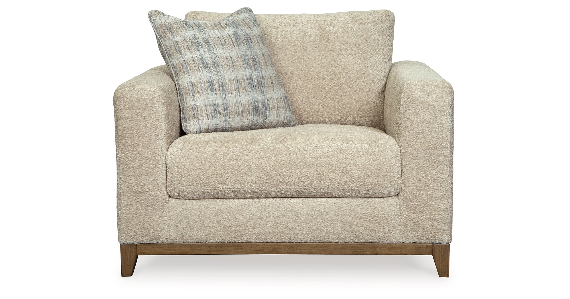Serene style with a modern sensibility. Delight in the cozy, versatile embrace of this oversized chair. It takes an on-trend approach to irresistible texture and natural beauty, showcasing soft upholstery accented with a transitional wood trim. As refined as it is laid back, the chair also keeps comfort a priority with a plush, thick seat cushion. — Luna Furniture introduces Parklynn Oversized Chair to enhance the beauty of your living spaces.