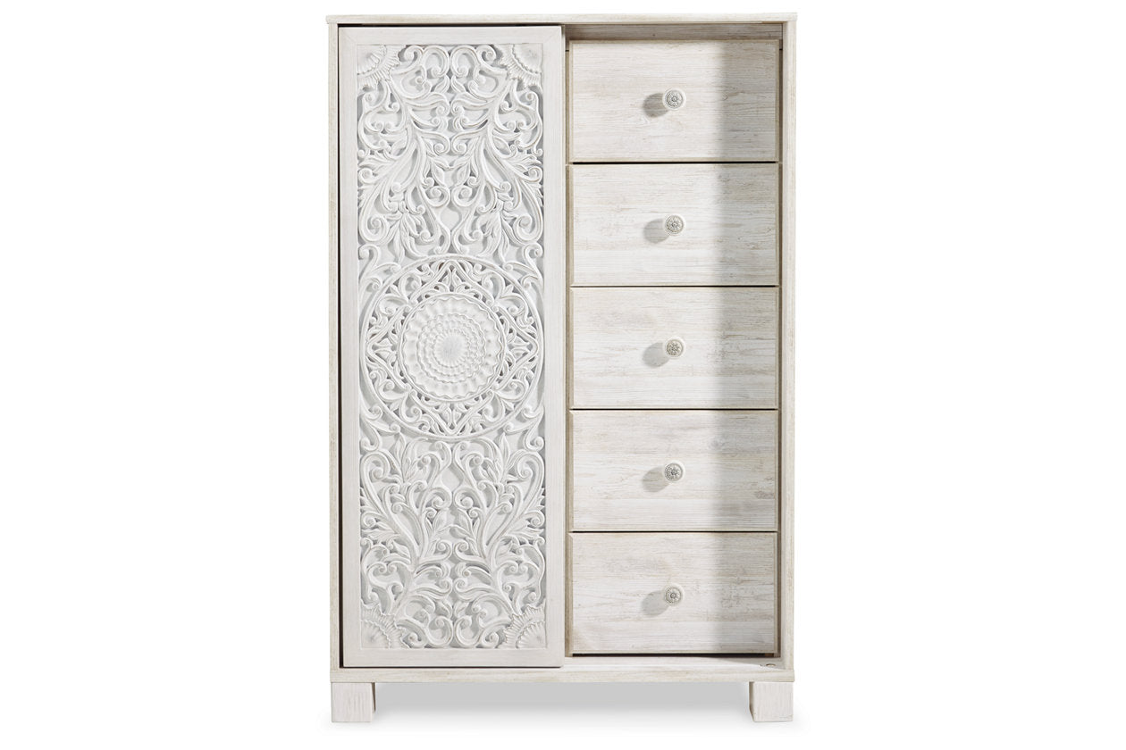 A one-of-a-kind girl deserves a bedroom retreat that celebrates her personal flair—and this boho-chic chest of drawers is so befitting. Wowing with an artful, carved-effect sliding door and richly distressed whitewash finish, this five-drawer chest with additional shelved storage is packed with possibilities. — Luna Furniture introduces Paxberry Dressing Chest to enhance the beauty of your living spaces.