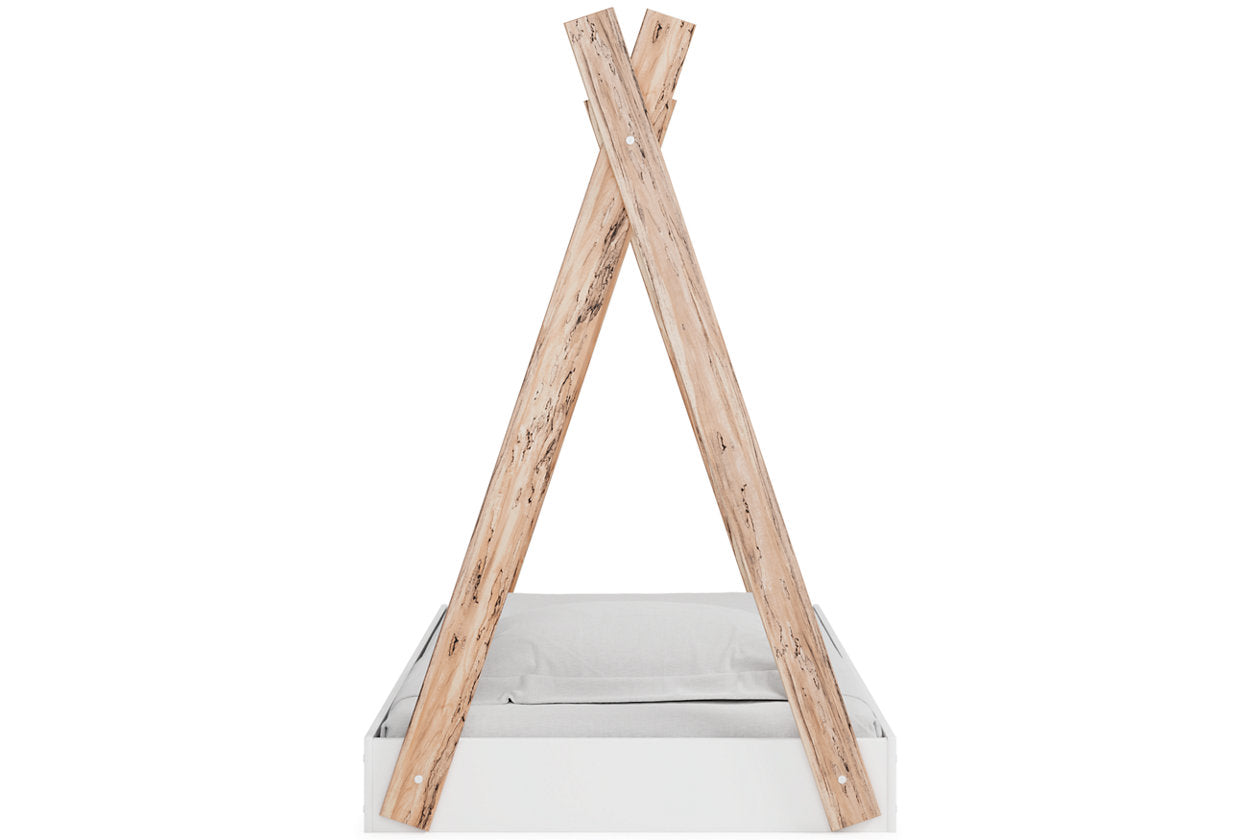 Adventure awaits with this twin tent complete bed in a box. The effortless blend of contemporary and casual styles creates an expressive two-tone look in matte white and replicated sugarberry wood grain pattern. This complete bed in a box requires no additional foundation, making it a functional, yet unique, addition to your home. — Luna Furniture introduces Piperton Twin Tent Complete Bed in Box to enhance the beauty of your living spaces.