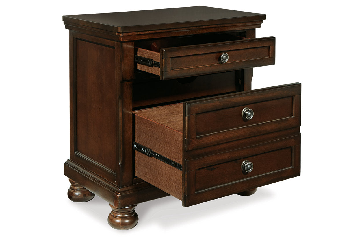 The quality craftsmanship is clear to see. The classic design elements—including antiqued hardware and bun feet—are easy to love. Satisfying your taste for traditional furnishings, this nightstand is elegant without looking fussy. Two drawers—one large, one small—keep bedside odds and ends within easy reach. A hidden pull-out tray behind the bottom drawer puts your small valuables out of sight. — Luna Furniture introduces Porter Nightstand to enhance the beauty of your living spaces.