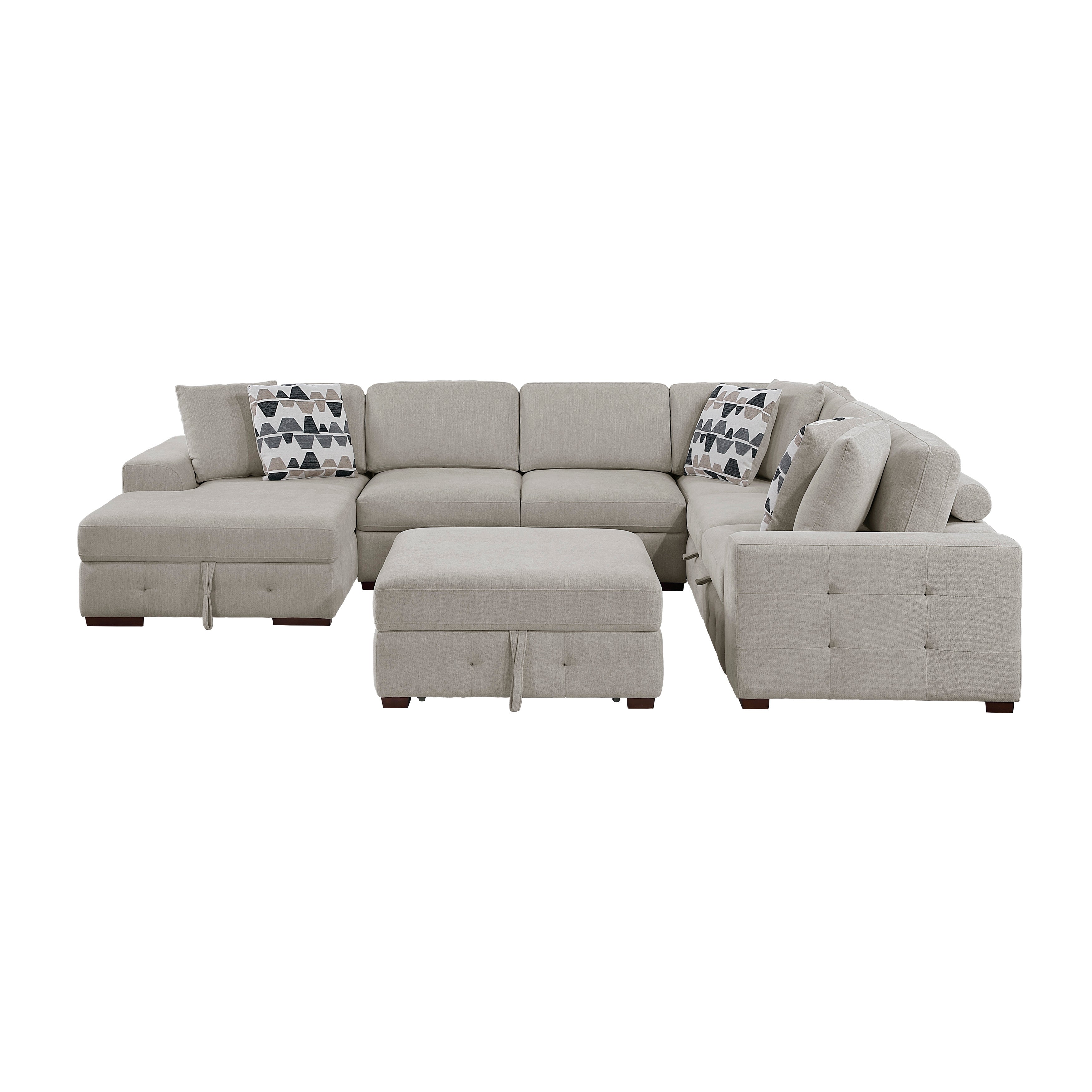 Create the ultimate entertainment and relaxation space with this five-piece chenille U-shaped sleeper sectional, featuring a left-side chaise with hidden storage, an armless two-seater, a corner seater, a right-side two-seater with a convenient pull-out bed, and a matching storage ottoman. The high-density memory foam padding over pocket coils and soft chenille fabric upholstery provide exceptional comfort and support for large gatherings or relaxing evenings. Reversible back and attached seat cushions extend the life of your sectional, while removable back cushion covers simplify cleaning. Tufted details add a touch of classic elegance, and the solid wood legs in an espresso finish provide a sophisticated foundation. Perfect for hosting guests, movie nights, or maximizing seating and storage, this sectional offers both style and functionality.