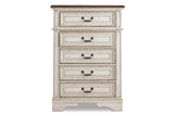 Elevating the art of traditional cottage styling, this chest of drawers is your dream bedroom retreat realized. Antiqued two-tone aesthetic blends a chipped white with a distressed wood finished top for added charm. Framed drawer fronts and decorative corbels add refinement, while bail pulls in a dark bronze-tone finish lend a classic touch. — Luna Furniture introduces Realyn Chest of Drawers to enhance the beauty of your living spaces.