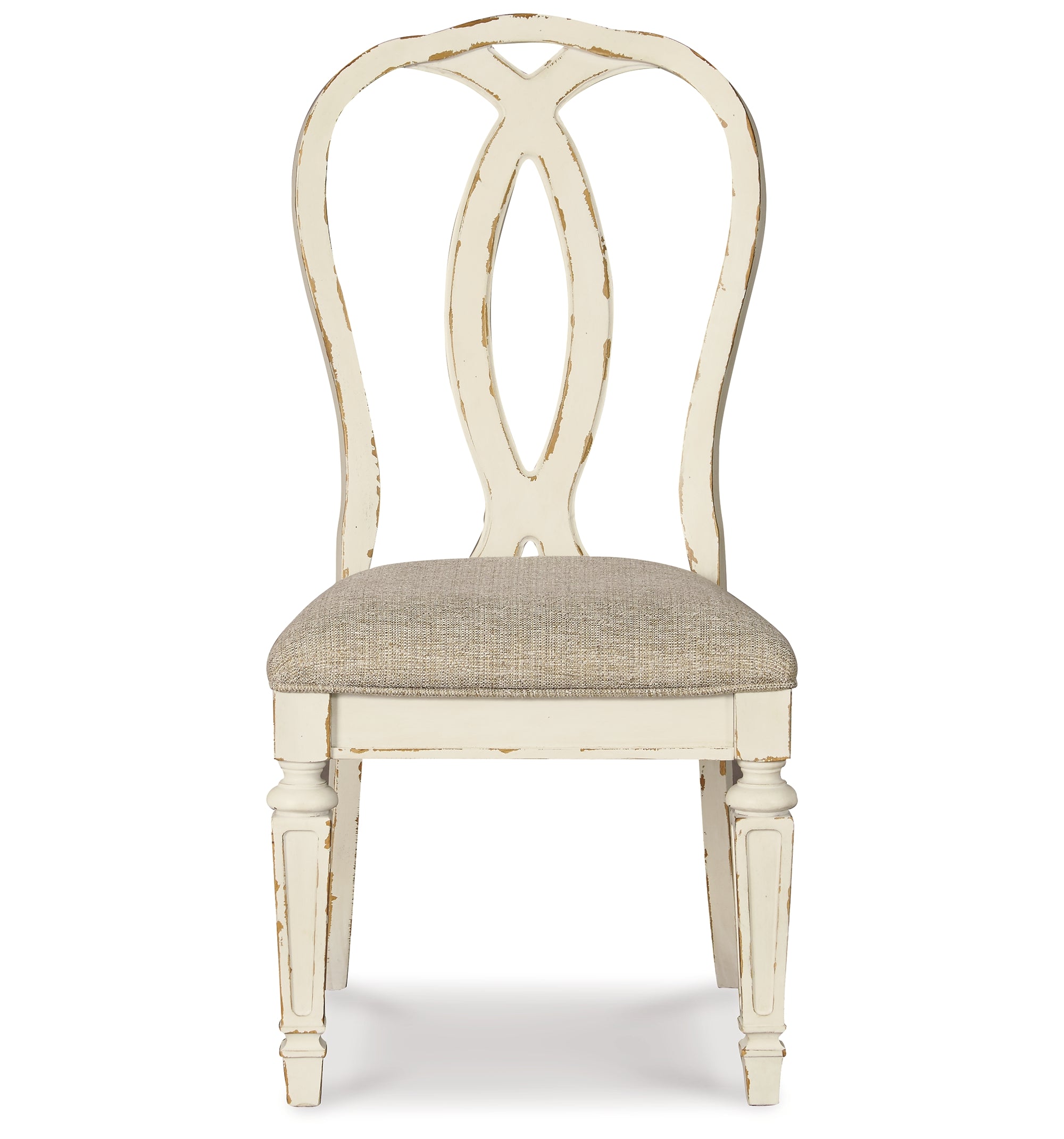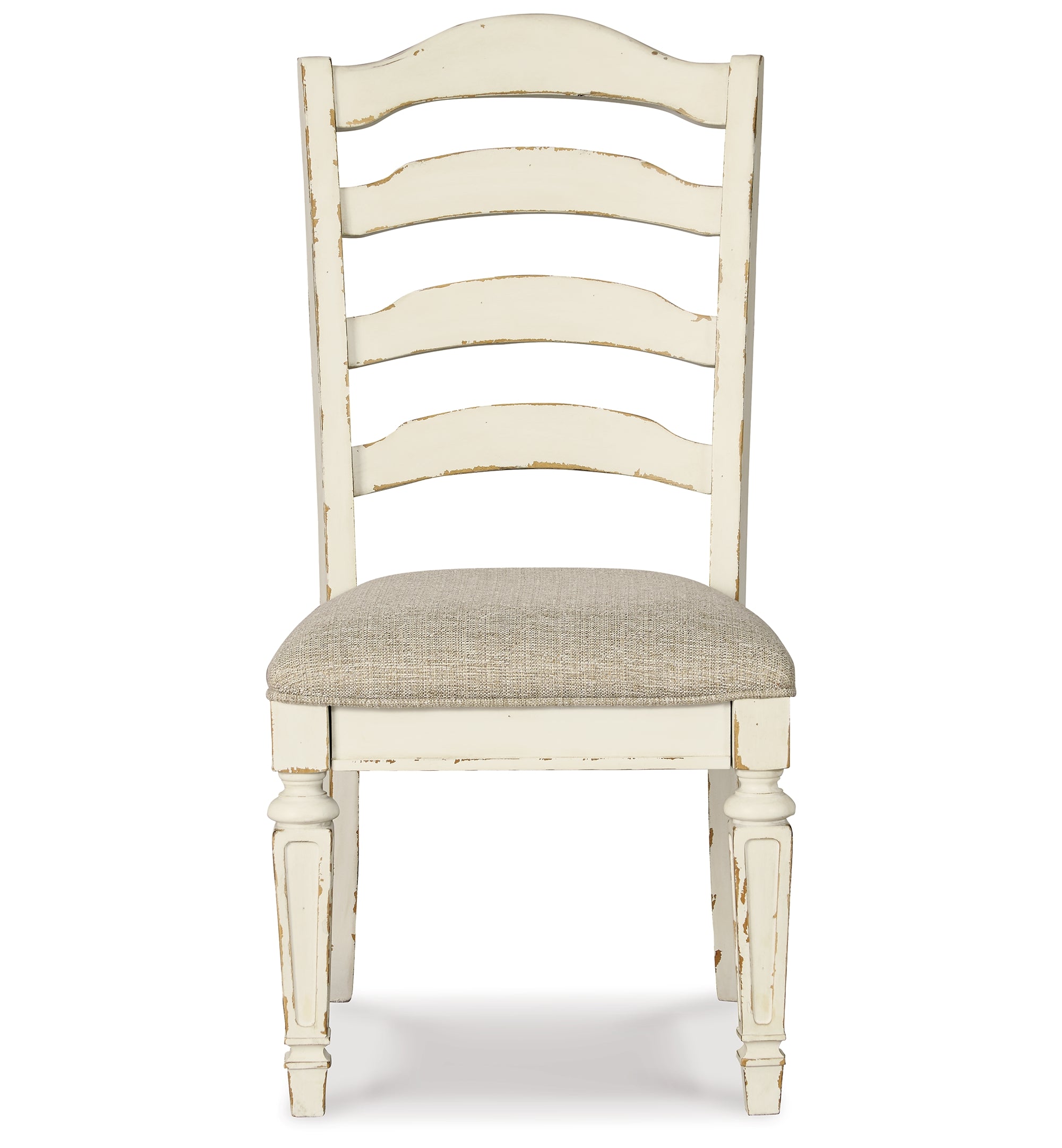 Bon appétit. This dining package has all the right ingredients for a French country-inspired feast for the eyes. Enhance your dining area and serve up a place for casually cool entertaining. Its antiqued two-tone aesthetic pairs a chipped white with distressed wood finished top and for twice the charm. Plushly cushioned seats are covered in textured oatmeal-tone fabric.