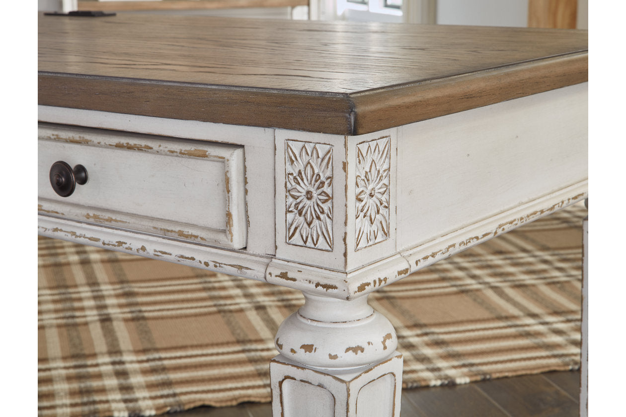 Elevating the art of traditional cottage styling, this desk is your heavenly home office realized. Its antiqued two-tone aesthetic blends a chipped white with a distressed wood tone top for added charm. Framed drawer fronts, decorative corbels and elegantly turned and tapered legs add refinement, while dark bronze-tone knobs lend a classic touch. — Luna Furniture introduces Realyn 60" Home Office Desk to enhance the beauty of your living spaces.