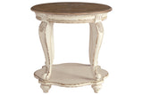 Elevating the art of traditional cottage styling, this round end table is sure to serve you beautifully for years to come. Antiqued two-tone aesthetic blends a chipped white with a distressed wood finished top for added charm. Classic cabriole legs and shapely lower shelf are a lovely twist. Decorative corbels add refinement. — Luna Furniture introduces Realyn End Table to enhance the beauty of your living spaces.