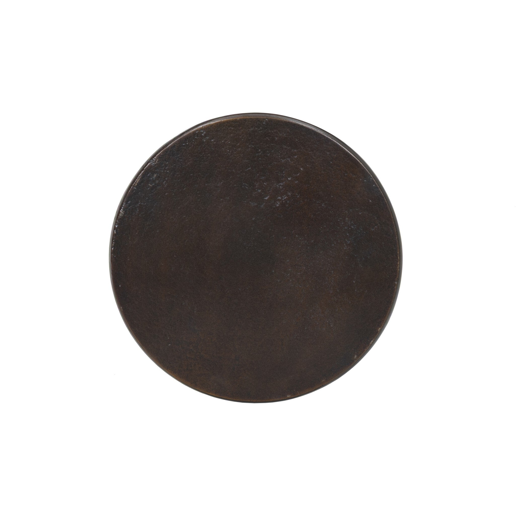 - An aluminum end table features a softened X-shaped, antique-finished base. Perfectly sized for your morning coffee or evening nightcap.