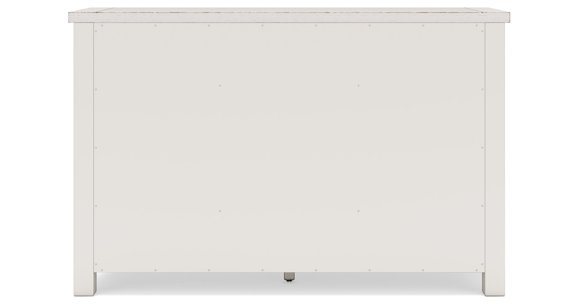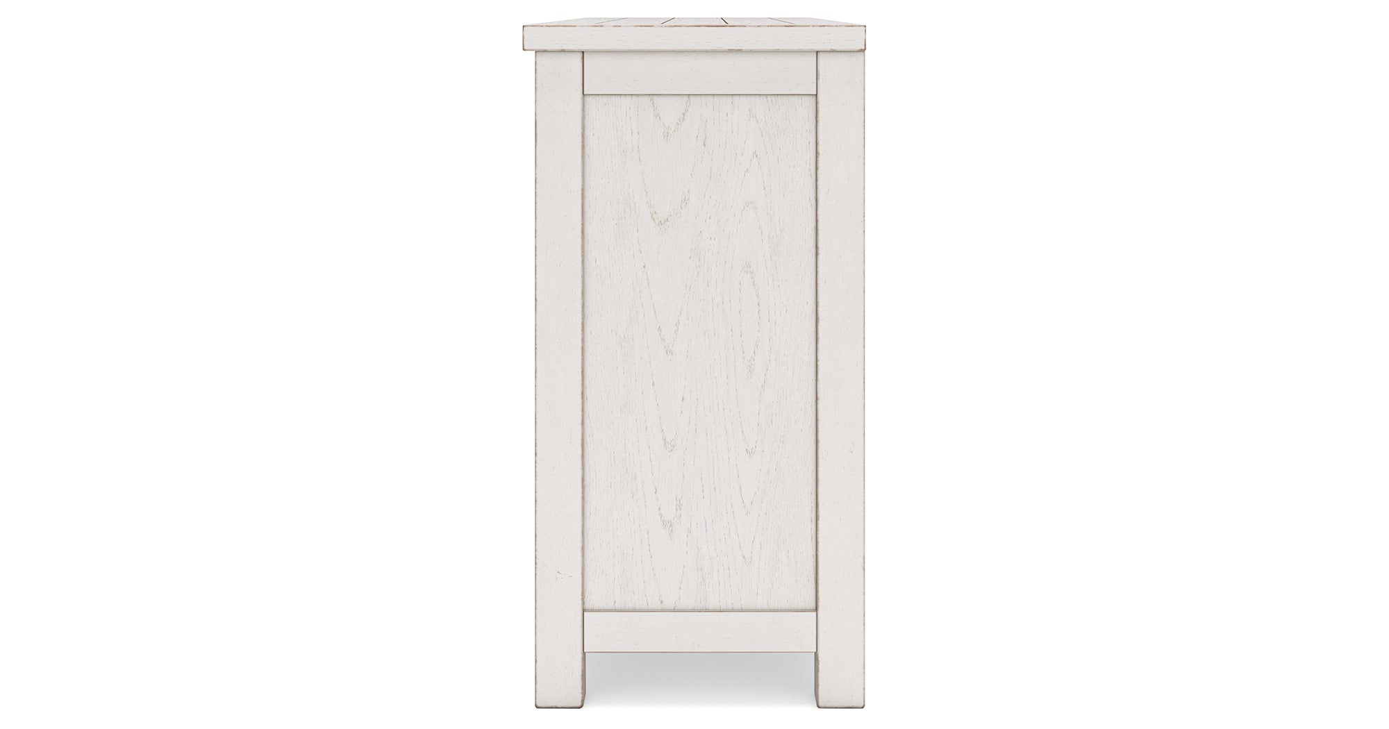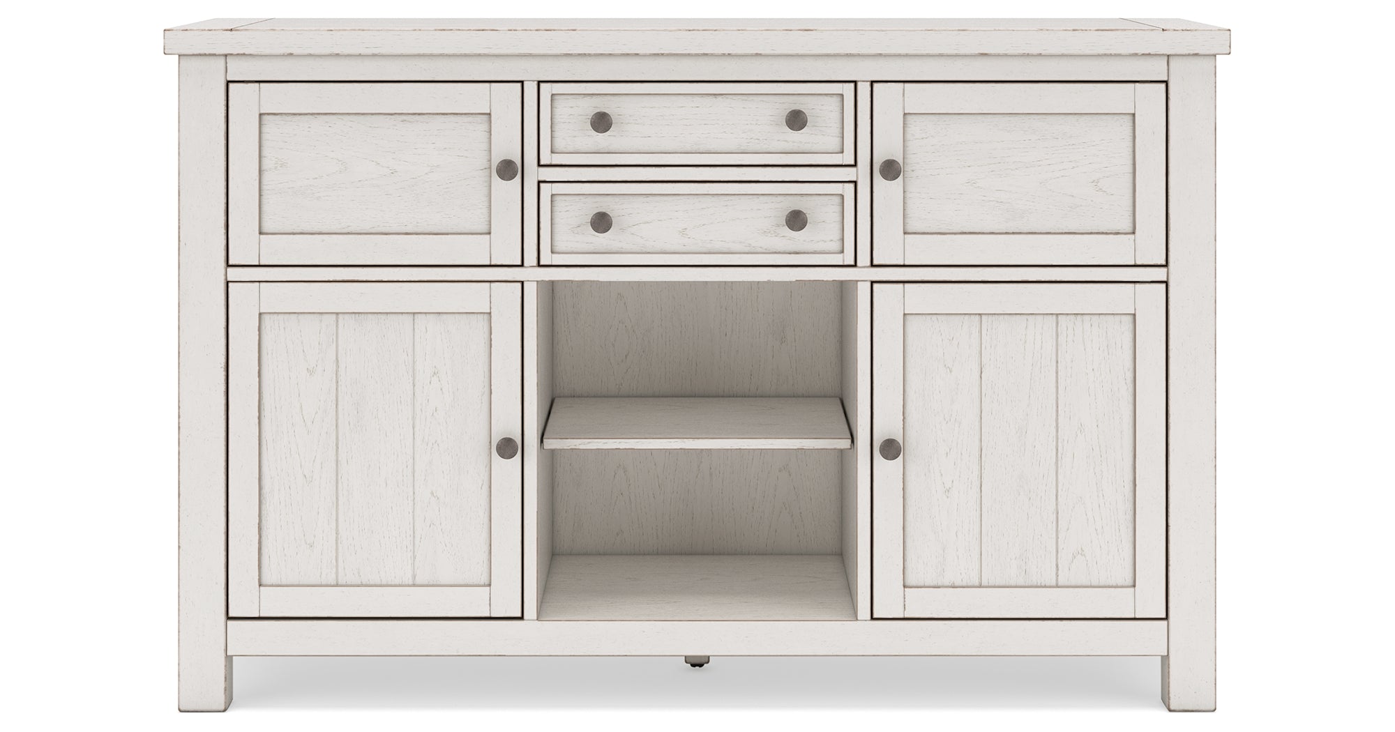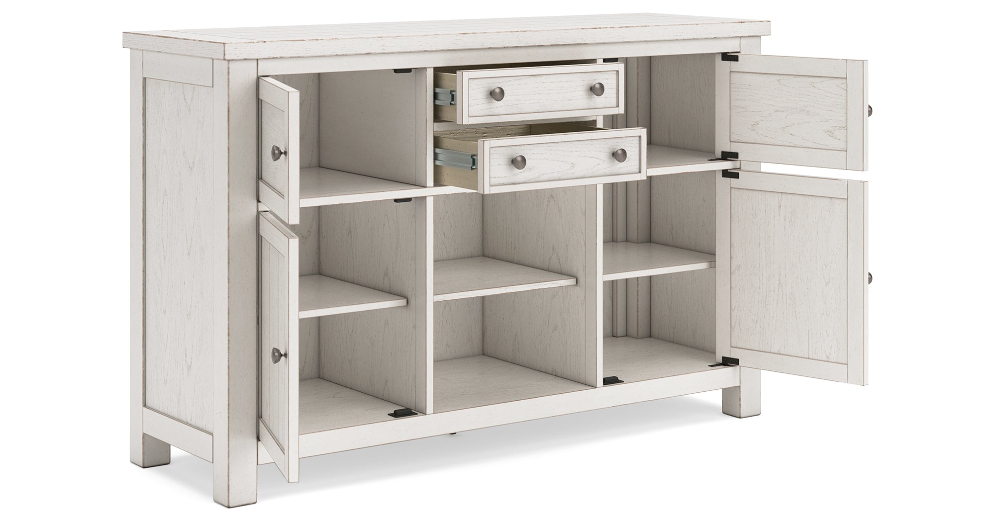 This dining package is sure to impress come mealtime. With its antiqued white finish and a planked effect tabletop, farmhouse-style dining has never been so fashionable. All that’s missing is you and your family.