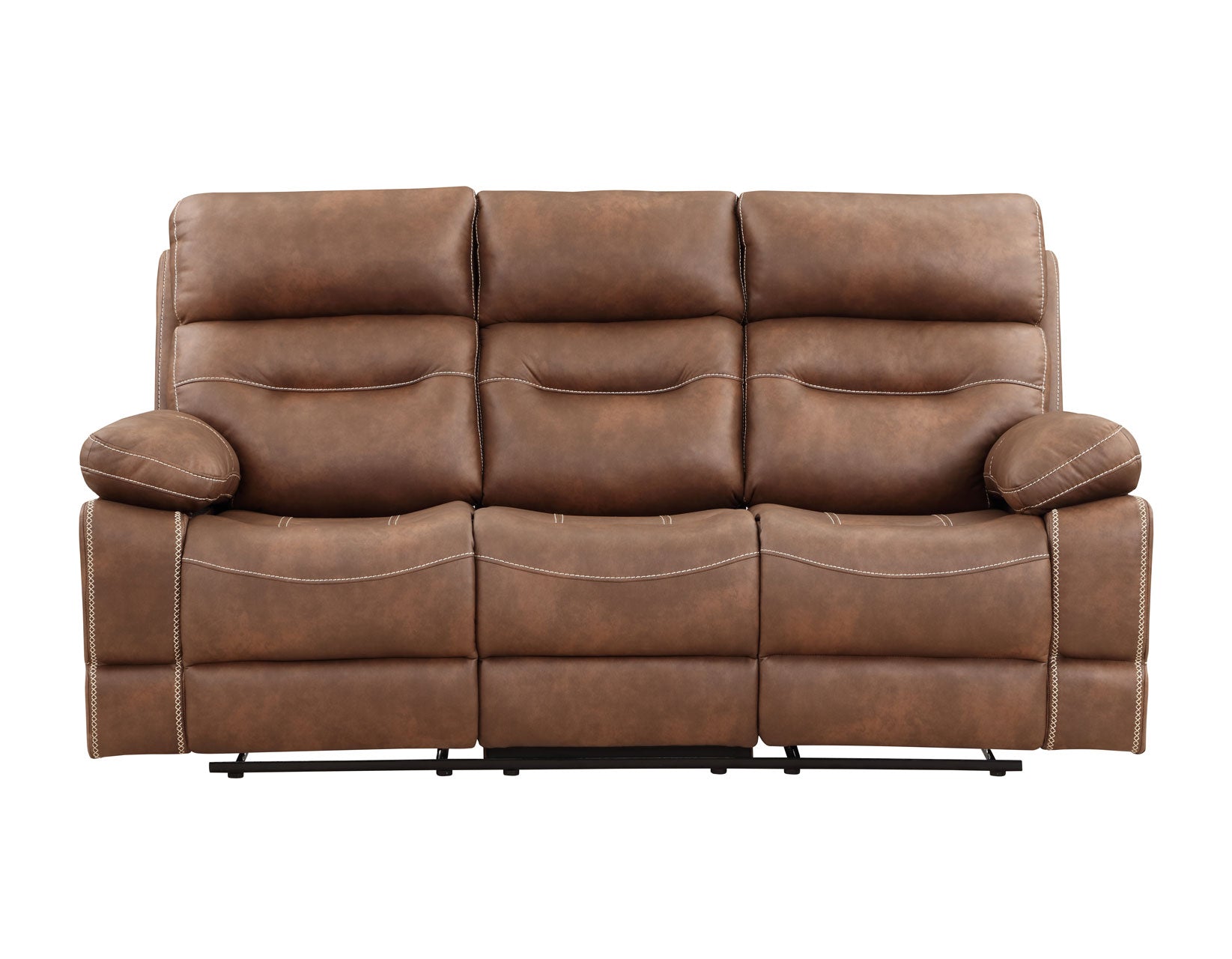 Experience the ultimate in relaxation and style with the Rudger reclining sofa. Sink into the deep comfort of its dimpled back, overstuffed arms, and headrest, and shaped seat, all featuring no-sag springs and pocket coils for the perfect balance of support and softness. The fiber-wrapped foam ensures that every moment spent on this sofa is pure bliss. With an effortless one-pull motion mechanism, you can quickly and easily recline to your preferred position, offering the ultimate in convenience and comfort. But it’s not just comfort that sets the Rudger sofa apart. The contrasting baseball stitching adds a touch of sophistication, while the chestnut brown microsuede cover exudes the rugged yet refined charm of an old bomber jacket. Experience the ultimate in relaxation and style with the Rudger sofa.