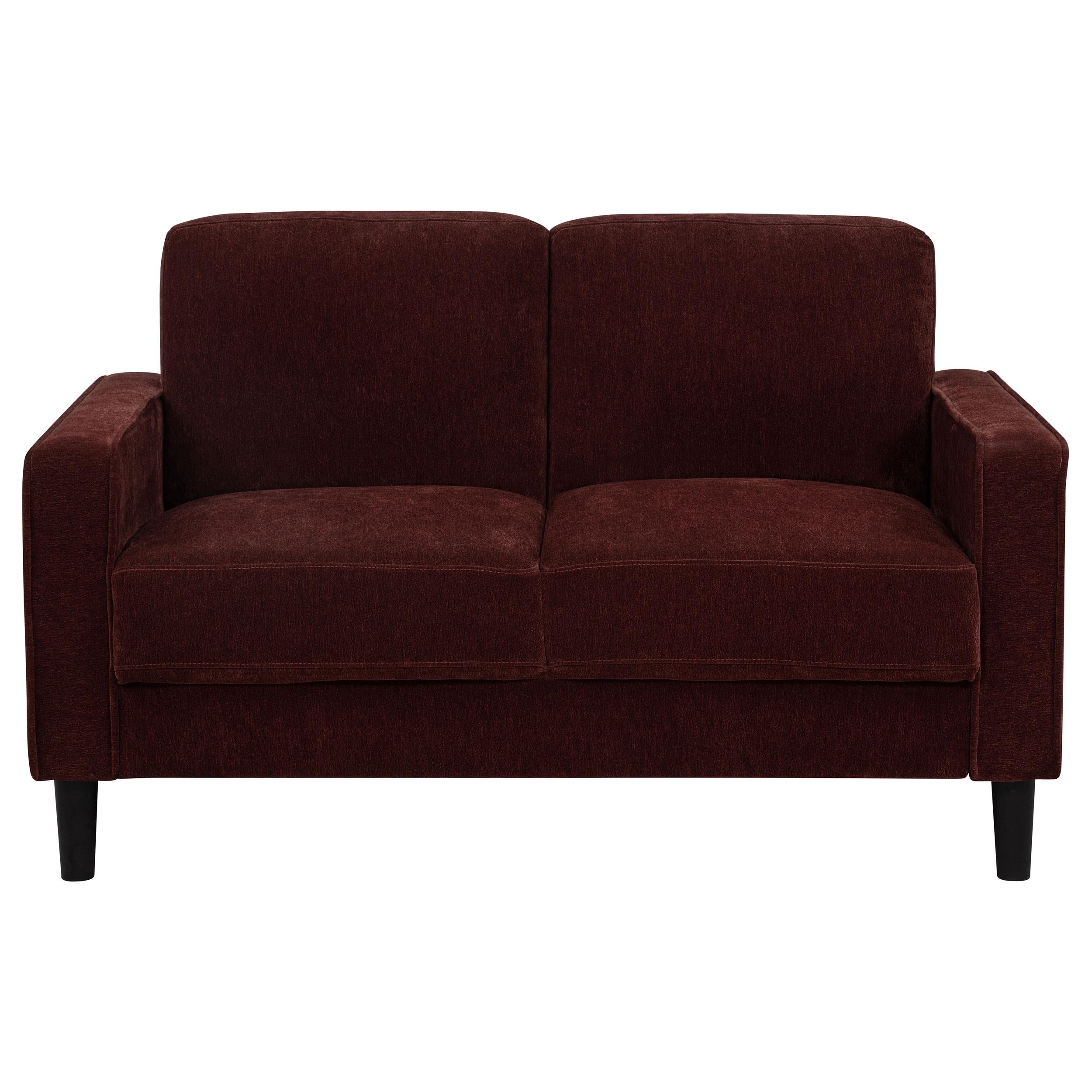 With a compact footprint and clean silhouette, this loveseat pairs soft structure with everyday versatility. Plush seat and back cushions rest within a tailored frame, defined by slim track arms and subtle piping. Angled legs add a modern touch beneath the smooth upholstery. Crafted with foam cushioning and supportive framing, this two-seater offers cozy seating for small living rooms, bedrooms, or guest areas.