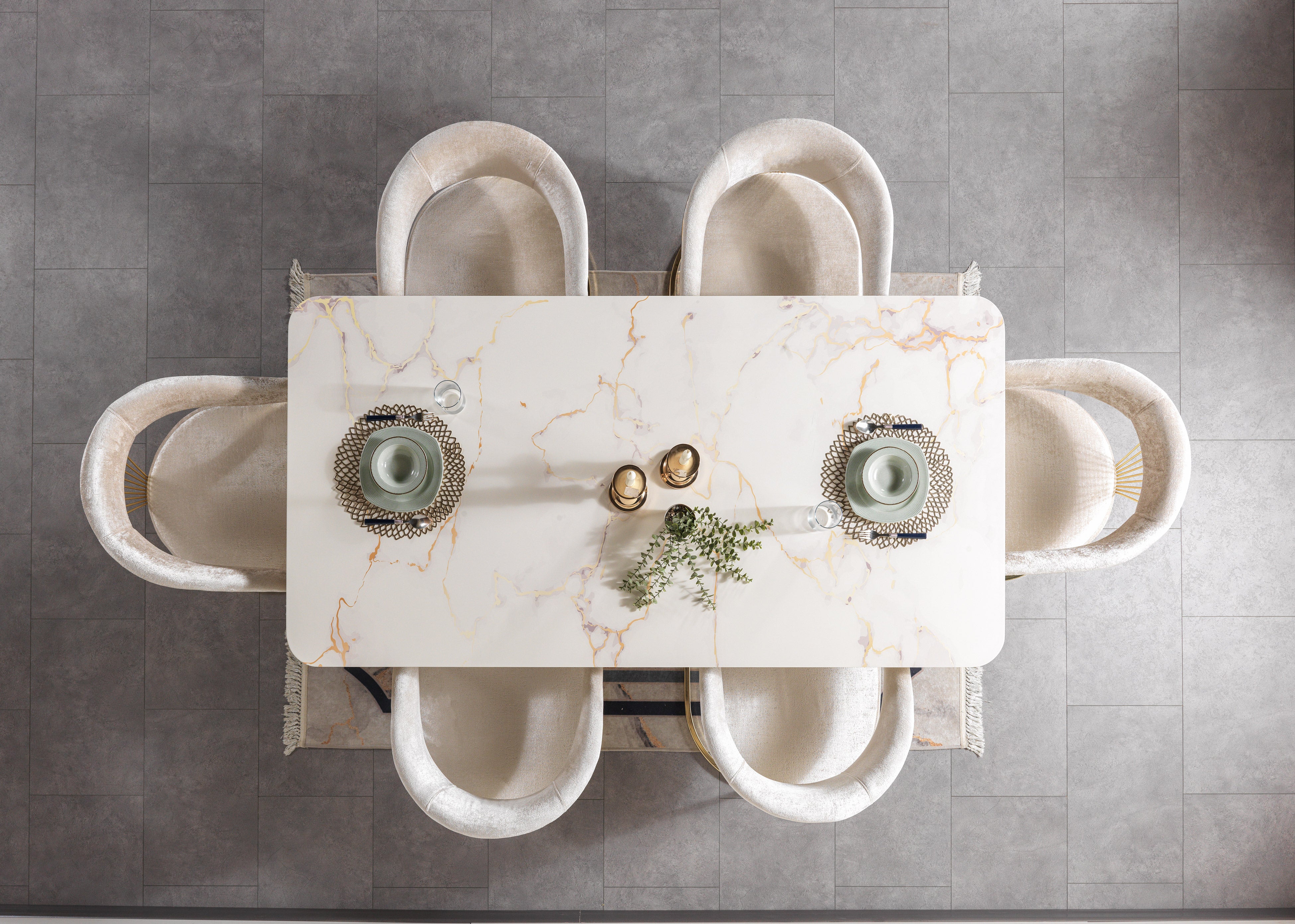 • Premium Tabletop: Dining table features a durable, high-gloss ivory finish with realistic marble-look veining and soft gold undertones.