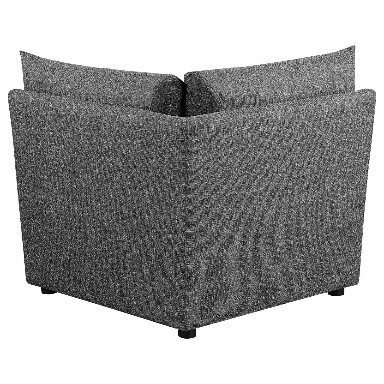 Create a haven for relaxation in your modern living space and provide an exceptionally comfortable place to gather for social events, family nights, or even solo respites with a roomy and tasteful six-piece sectional. Start with sturdy construction of pine wood with plywood, offering a durable frame, then move to foam and feather filling that creates an enticingly full look and cushy feel. Barely black fabric upholstery is dramatic and yet versatile, adding an impact in a contemporary living room or media room. Removable back and seat cushions extend seating comfort. Set includes three armless chairs, one corner wedge, one left-facing end unit and one right-facing end unit.