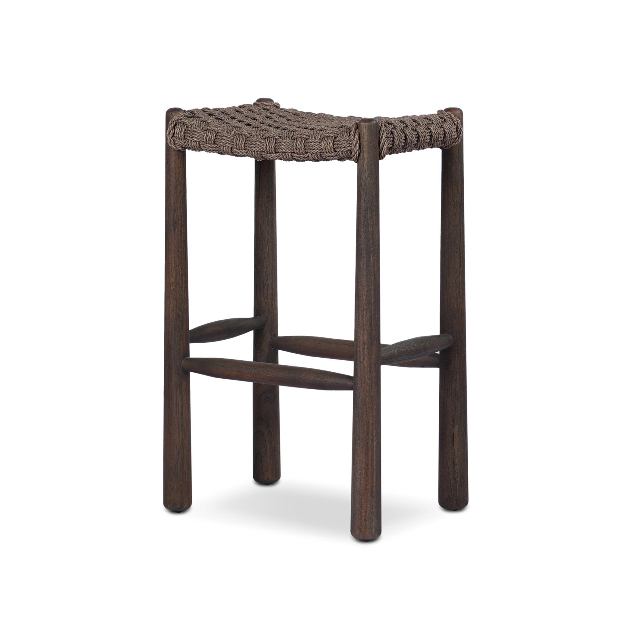 - Exaggerated tapered legs support the saddle-style seat of this outdoor bar stool, finished with a chunky box weave. Cover or store inside during inclement weather and when not in use. A design collaboration by Amber Lewis and Four Hands. This item has limited online distribution and may not be sold on websites without prior approval. Visit the FAQ page in our Help Center for more details.